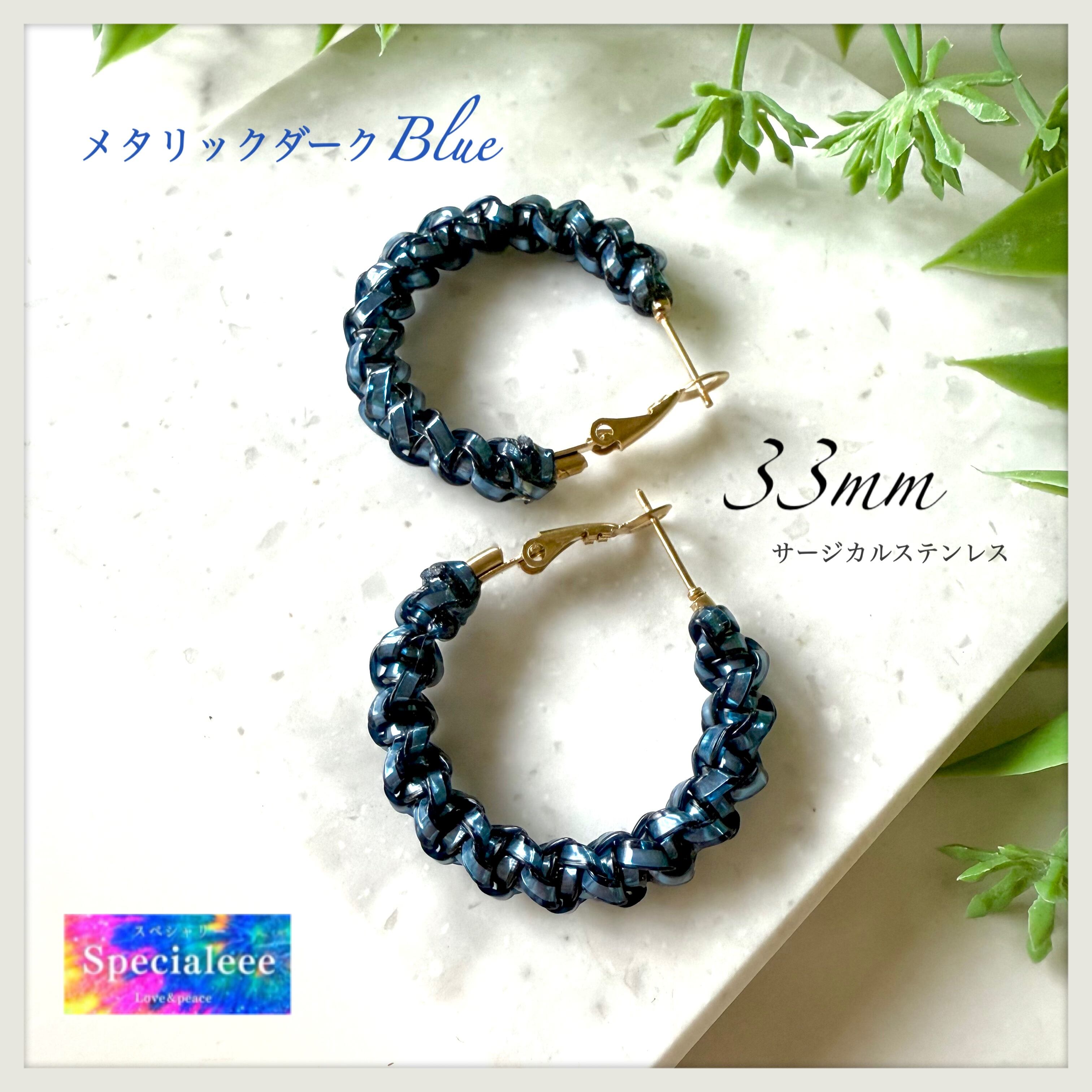 限定カラー★33mm★青メタリックダークブルー編みフープピアス★アレルギー対応サージカルステンレス★存在感★個性的に★