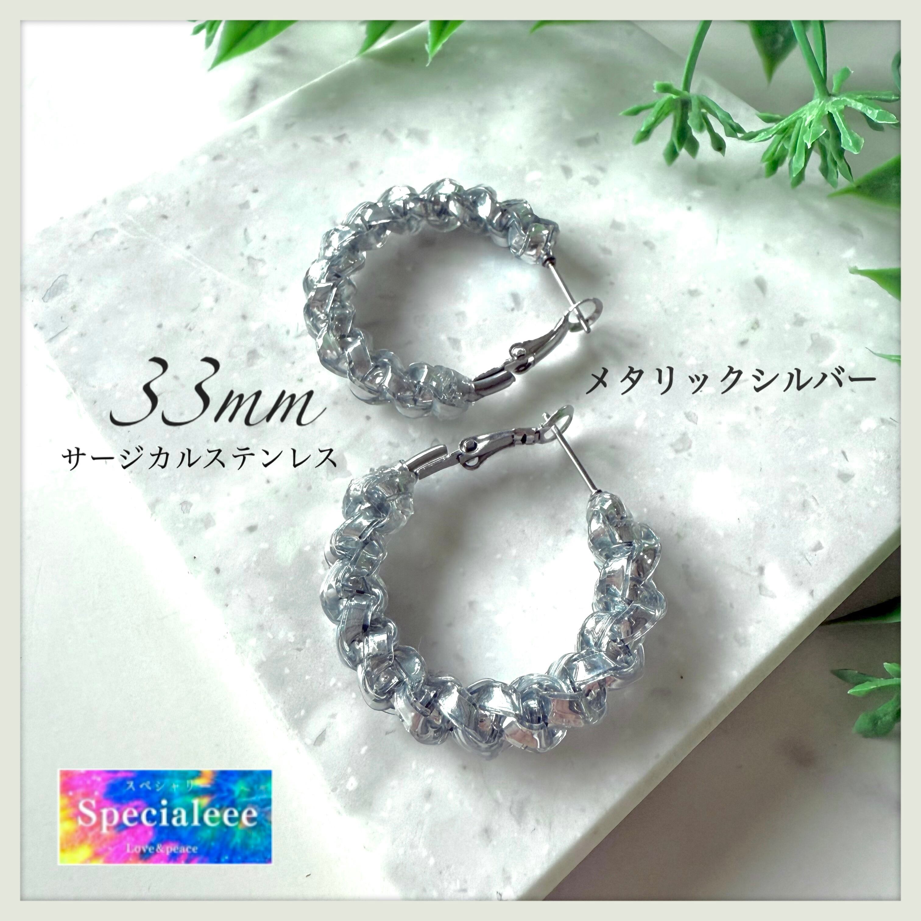 33mm☆メタリックシルバー編みフープピアス★アレルギー対応サージカルステンレス★存在感★個性的に★インパクト★