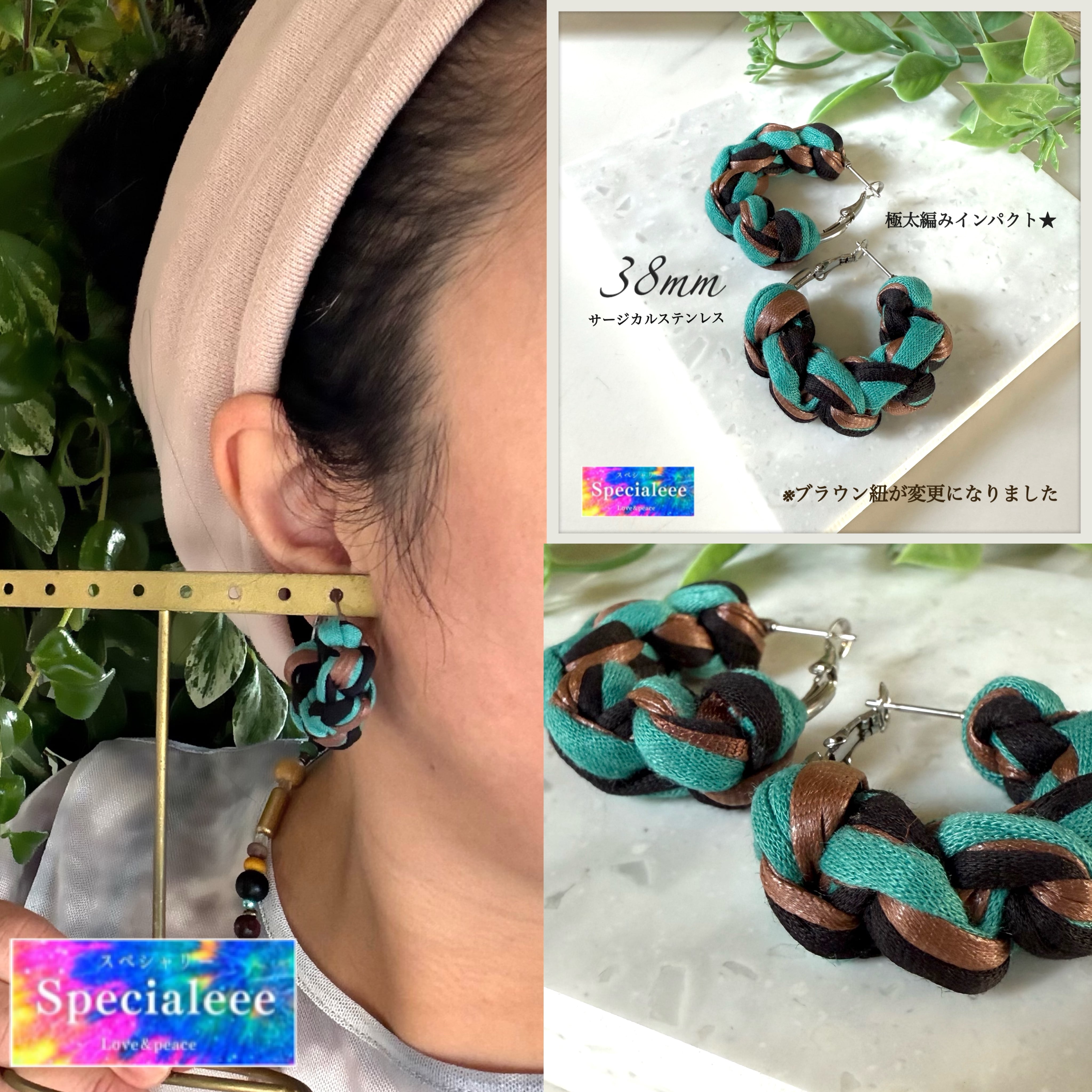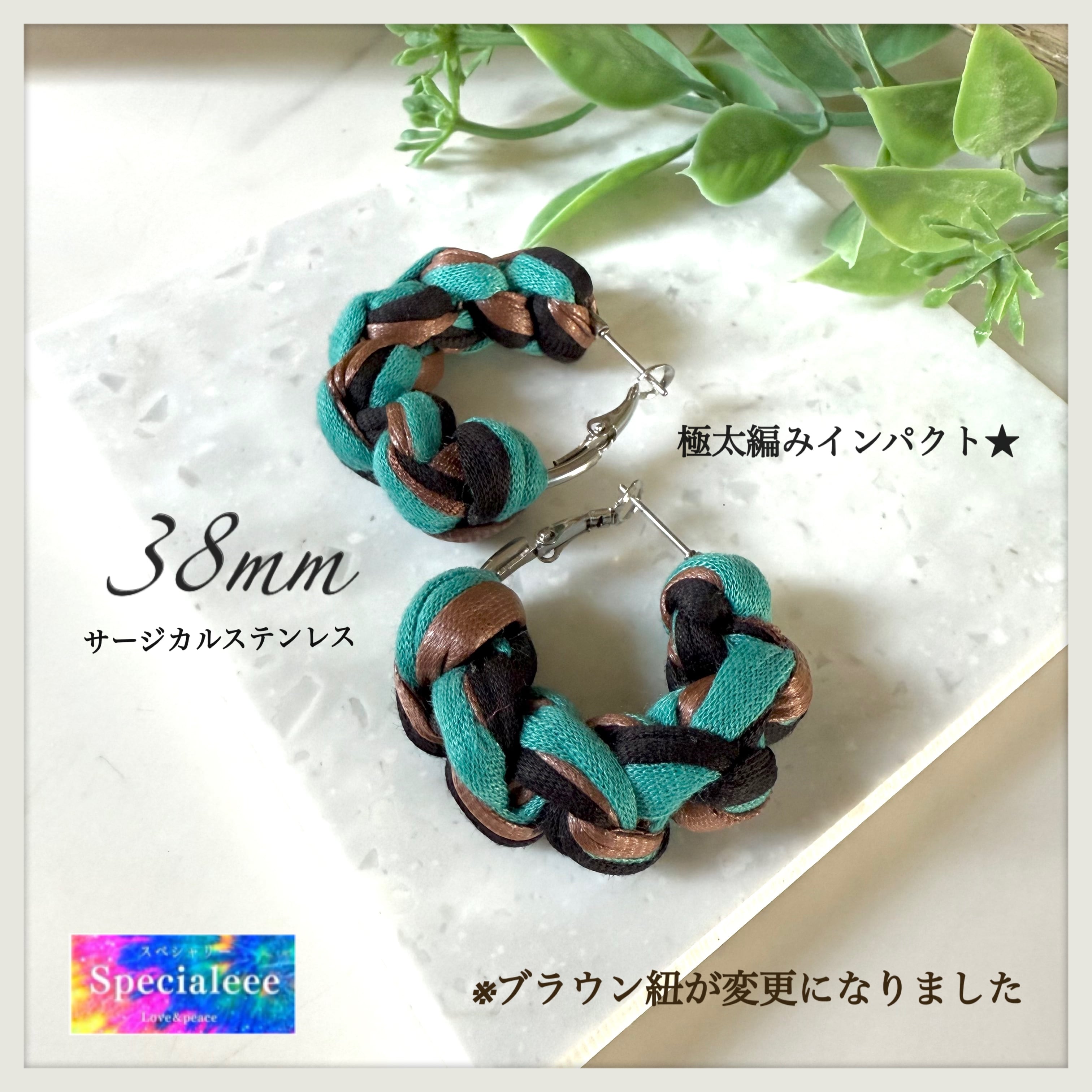 極太インパクト編み38mm★ターコイズブラウンブラック編みフープピアス★存在感★秋冬お洒落カラー★サージカルステンレス★数量限定★オリジナルカラー★