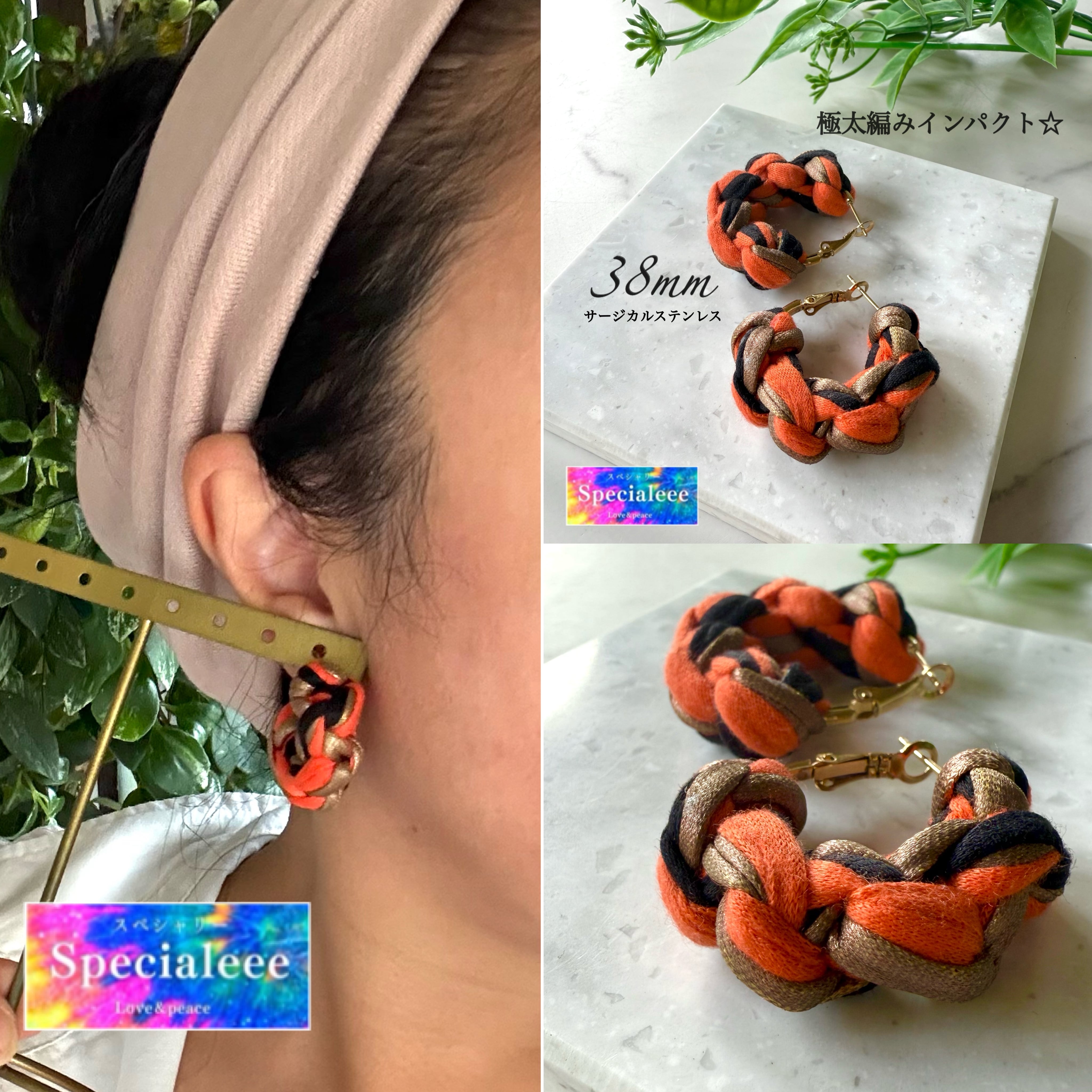 極太インパクト編み38mm★オレンジ、ブラウン、ブラック編みフープピアス★オリジナルお洒落カラフル★サージカルステンレス☆秋冬オススメカラー★数量限定!