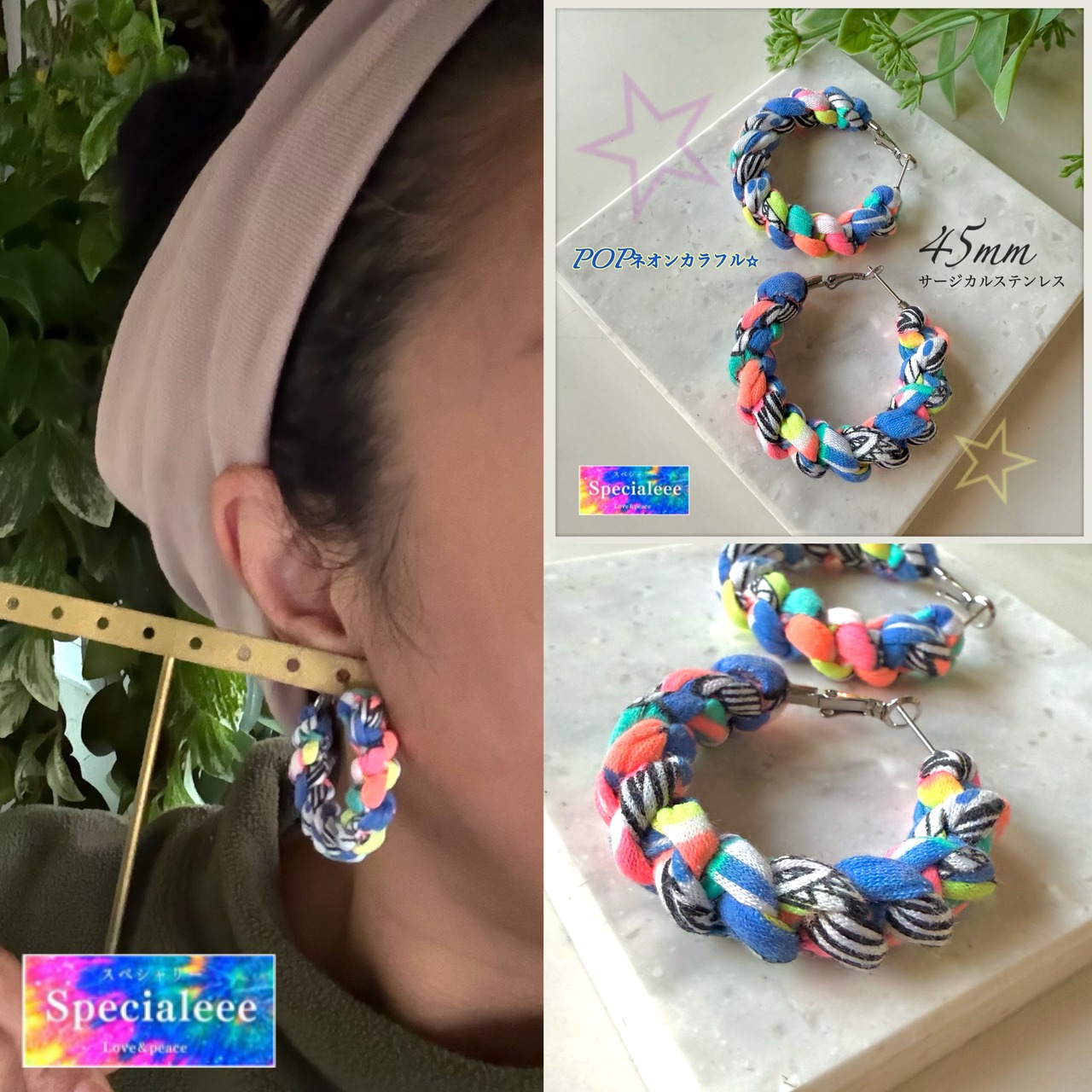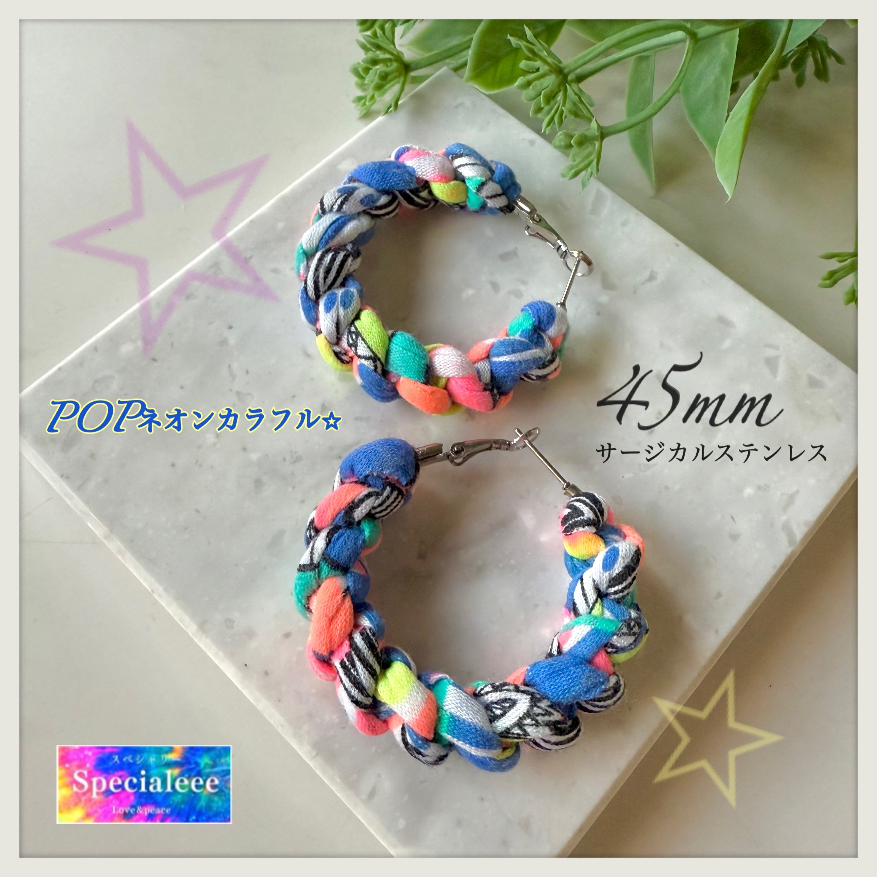 NEW★45mmポップネオンカラフル太編みフープピアス★派手可愛い★アレルギー対応サージカルステンレス★蛍光POP★個性的インパクト★