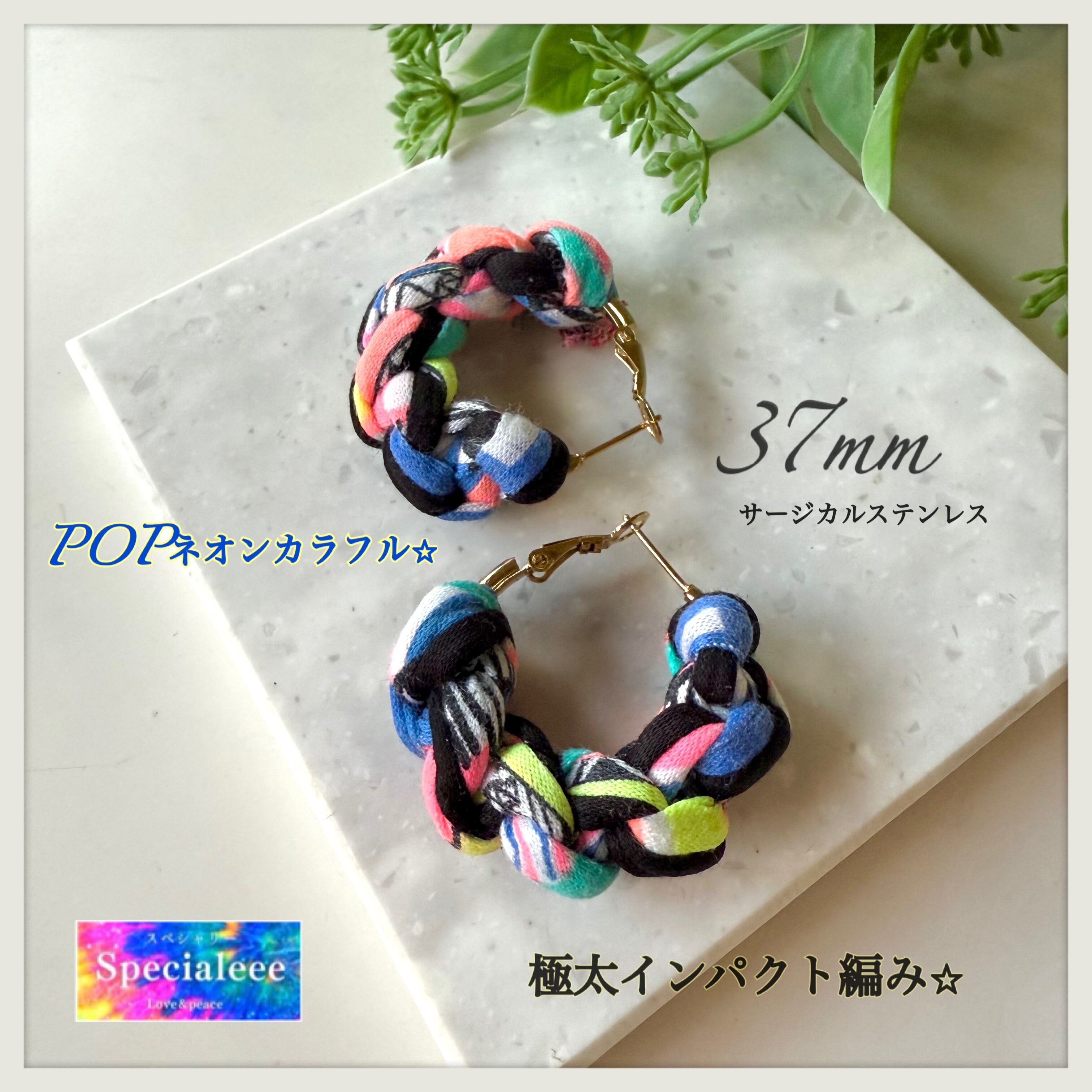 NEW★2本極太編み★37mmフープピアス★ポップネオンカラフル&黒ブラックミックス★アレルギー対応サージカルステンレス★個性的インパクト★