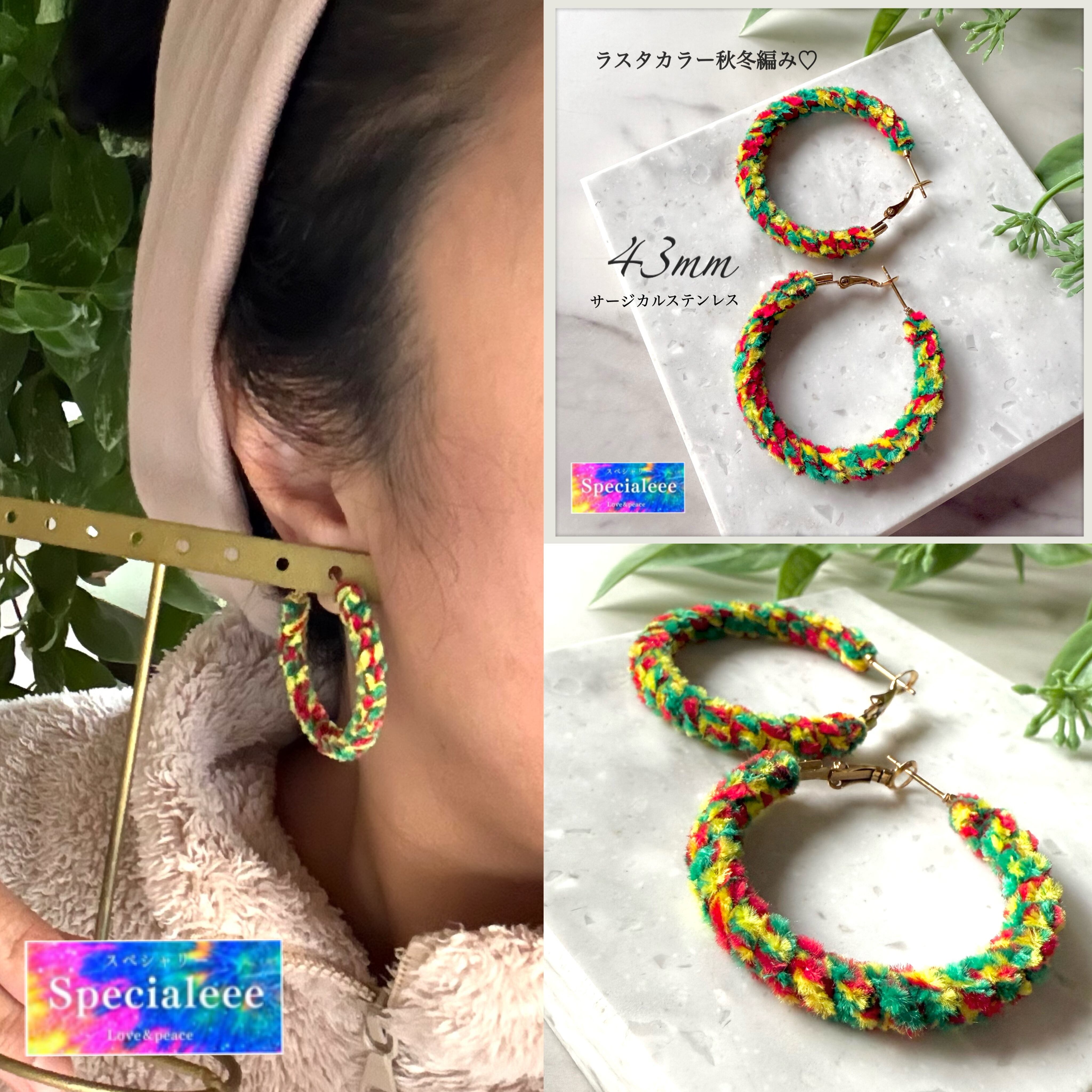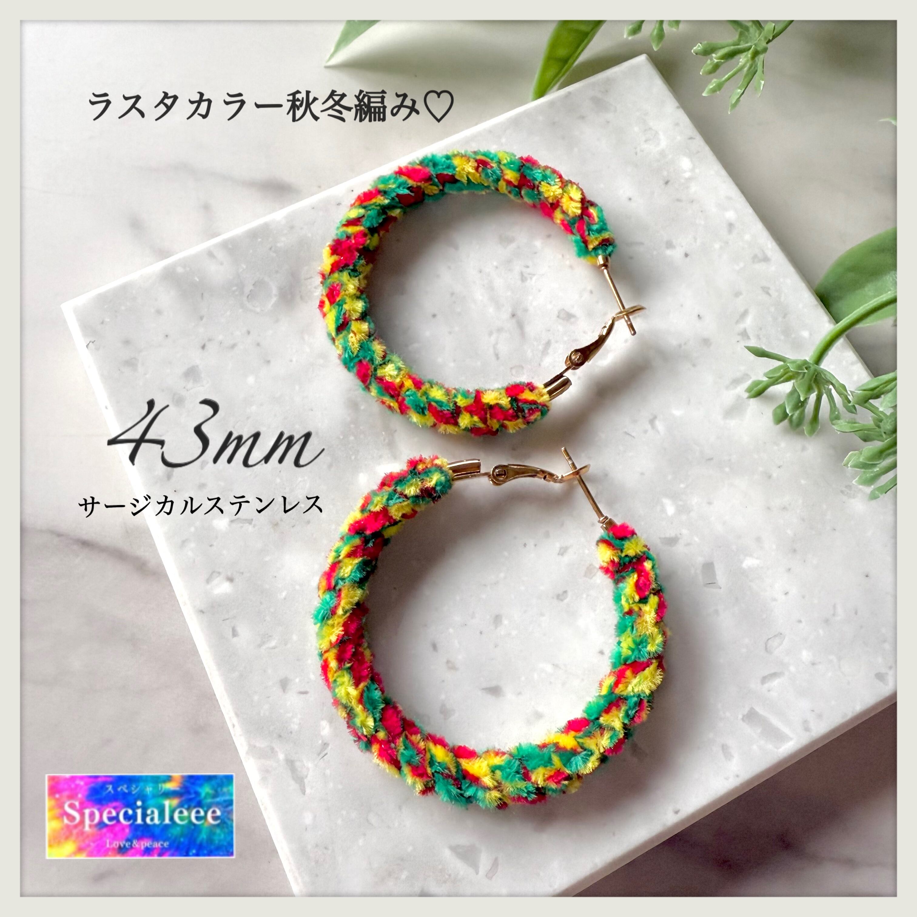 43mm★ラスタカラー秋冬編みオリジナルフープピアス★サージカルステンレス★赤緑黄色★素材感★レゲエ★アフリカン★