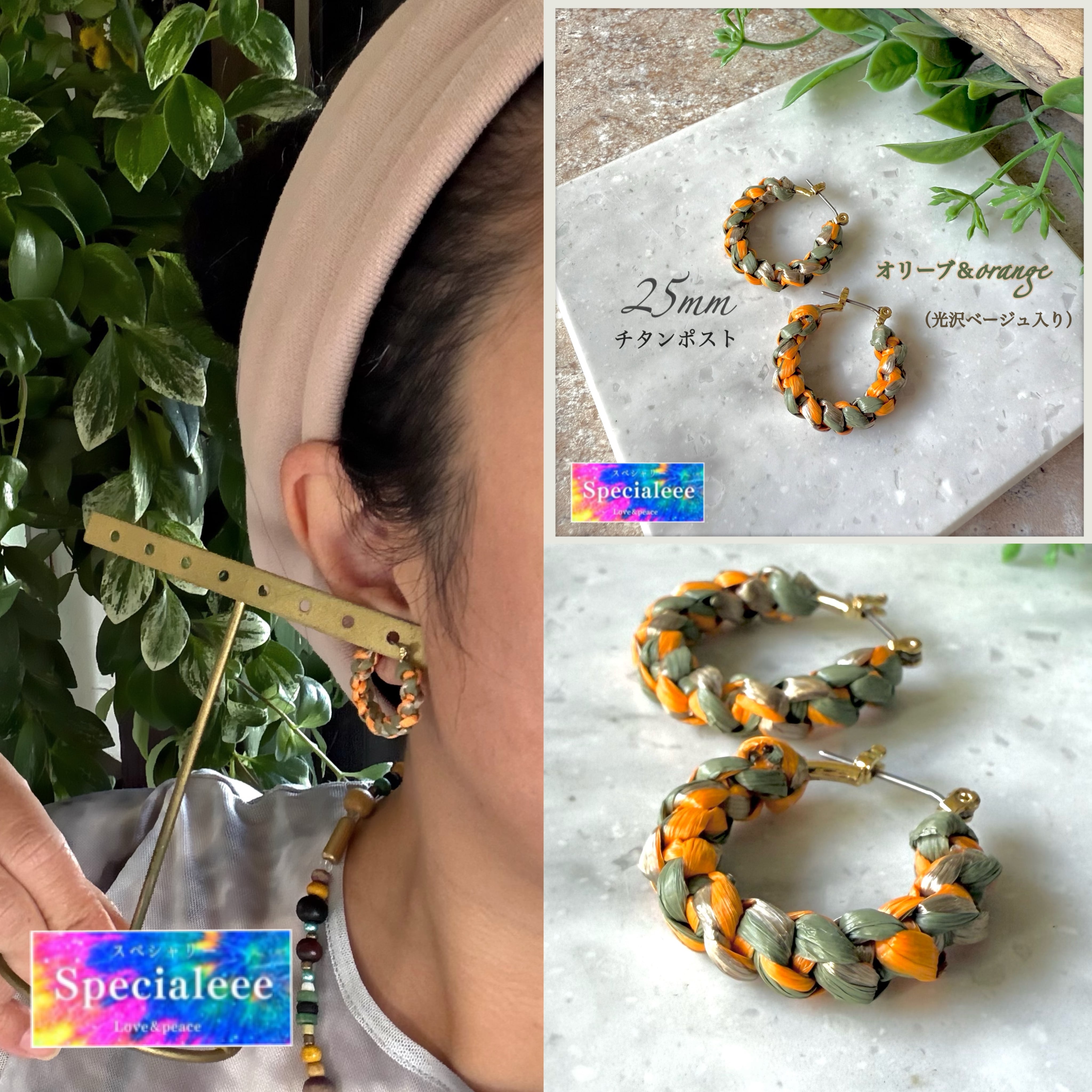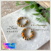オリーブカラフルマジック★25mmカーキ&オレンジ&光沢ベージュ編みフープピアス★アレルギー対応チタンポスト★お洒落カラー★こちらのサイズのみイヤリング無料★