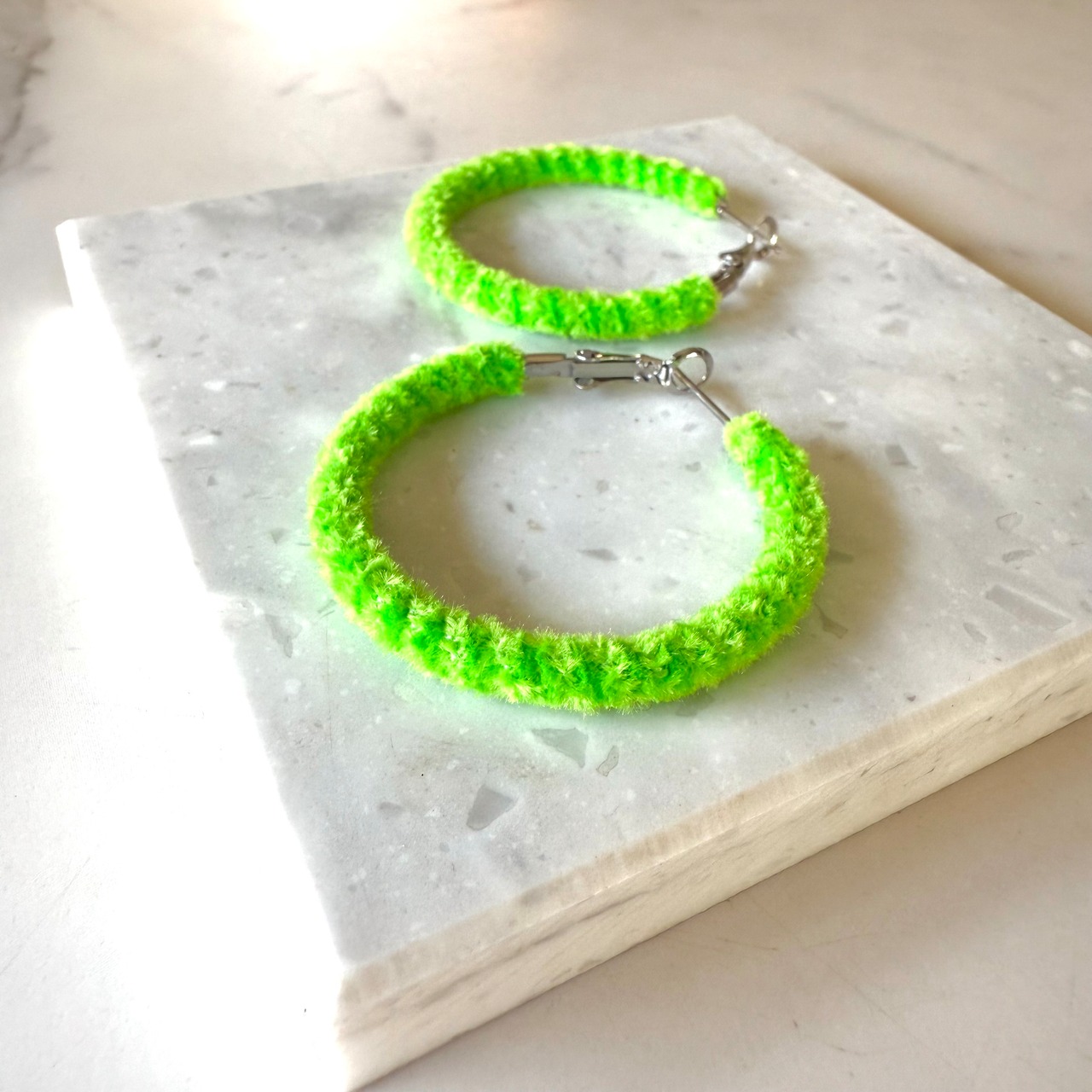 ネオンマジック★42mm鮮やか蛍光グリーン編みフープピアス★派手可愛くて個性的★アレルギー対応サージカルステンレス★黄緑★