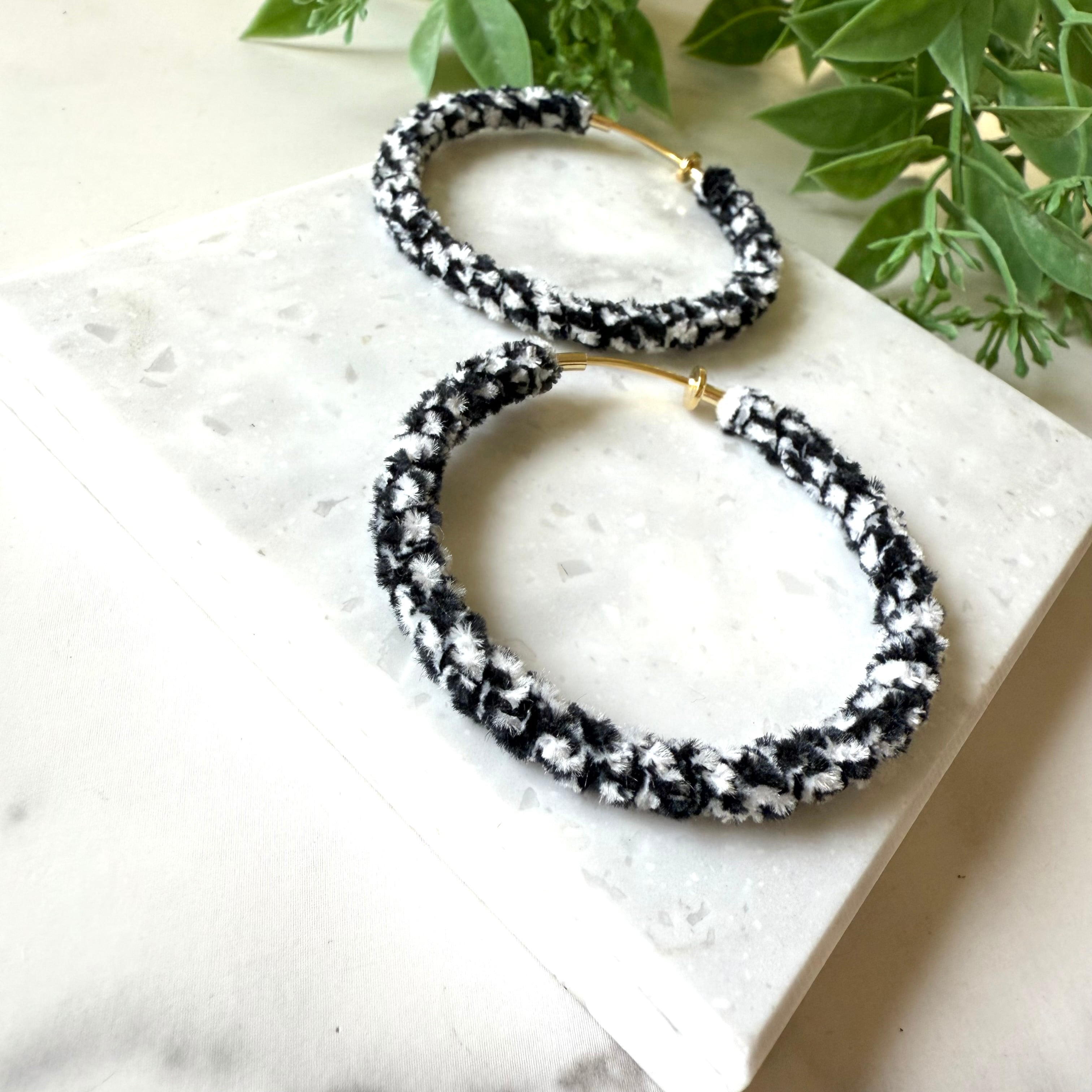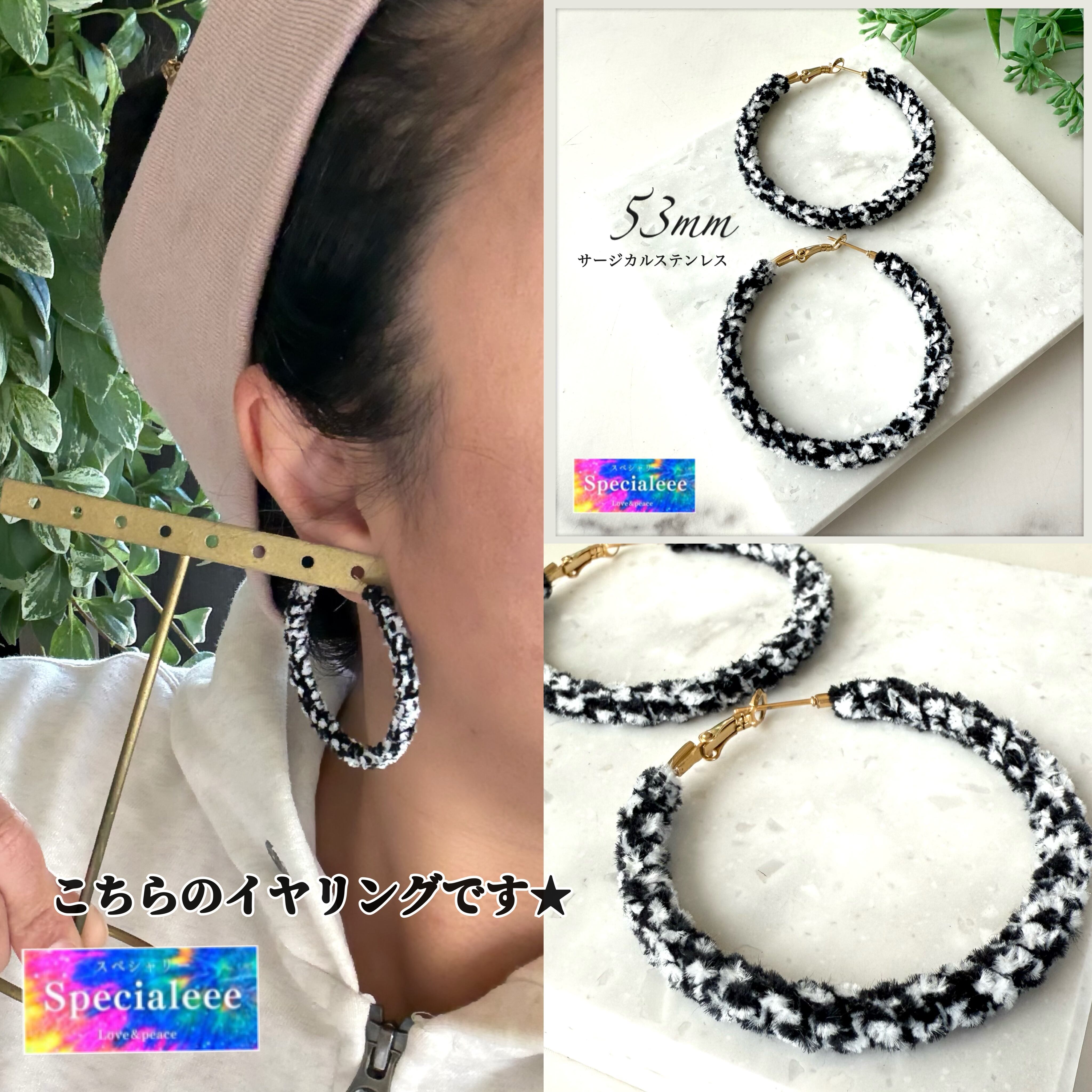 《イヤリングページ》53mm★白黒ふわもこ編みフープピアス★ダルメシアン★千鳥柄★ツイード★秋冬素材感★アレルギー対応サージカルステンレス