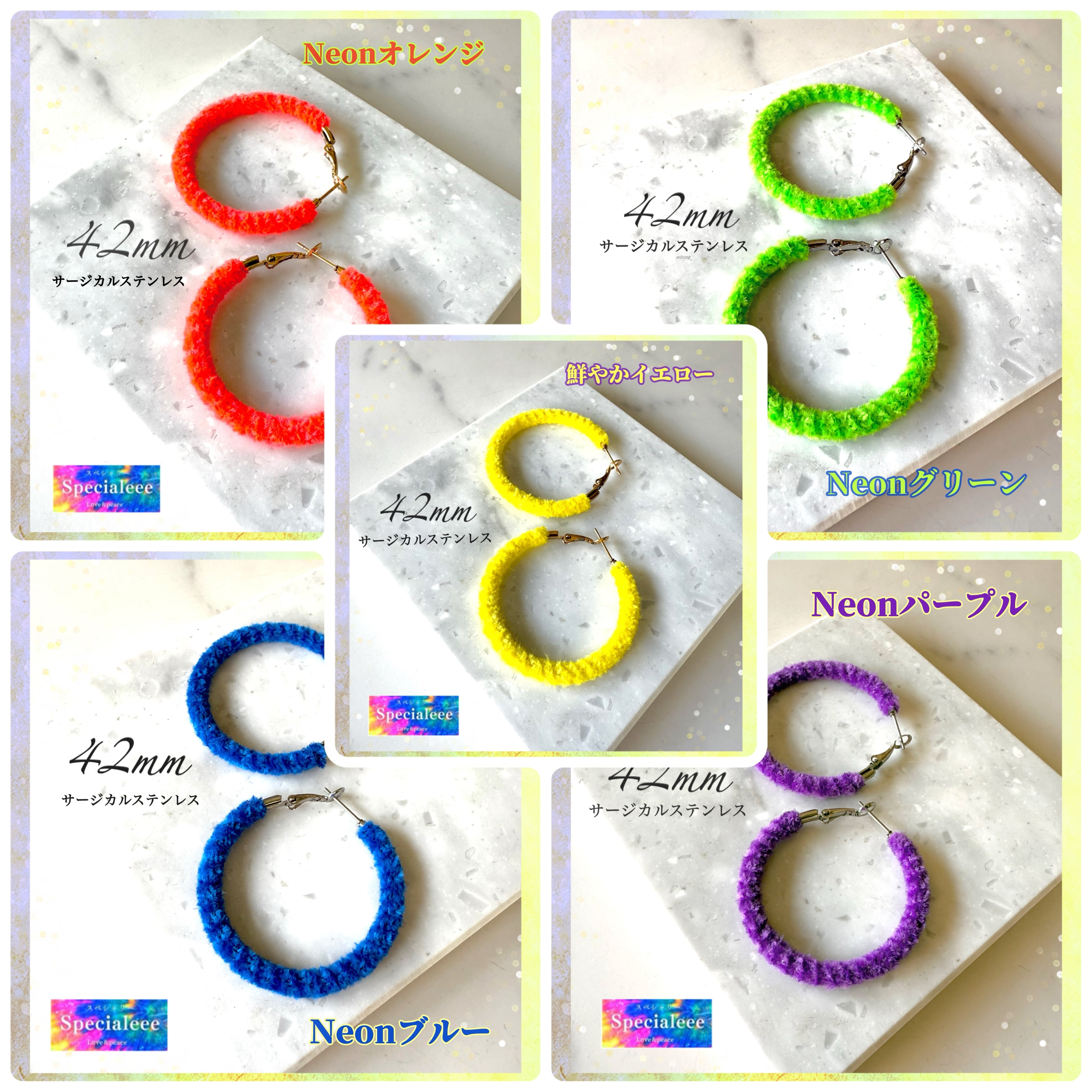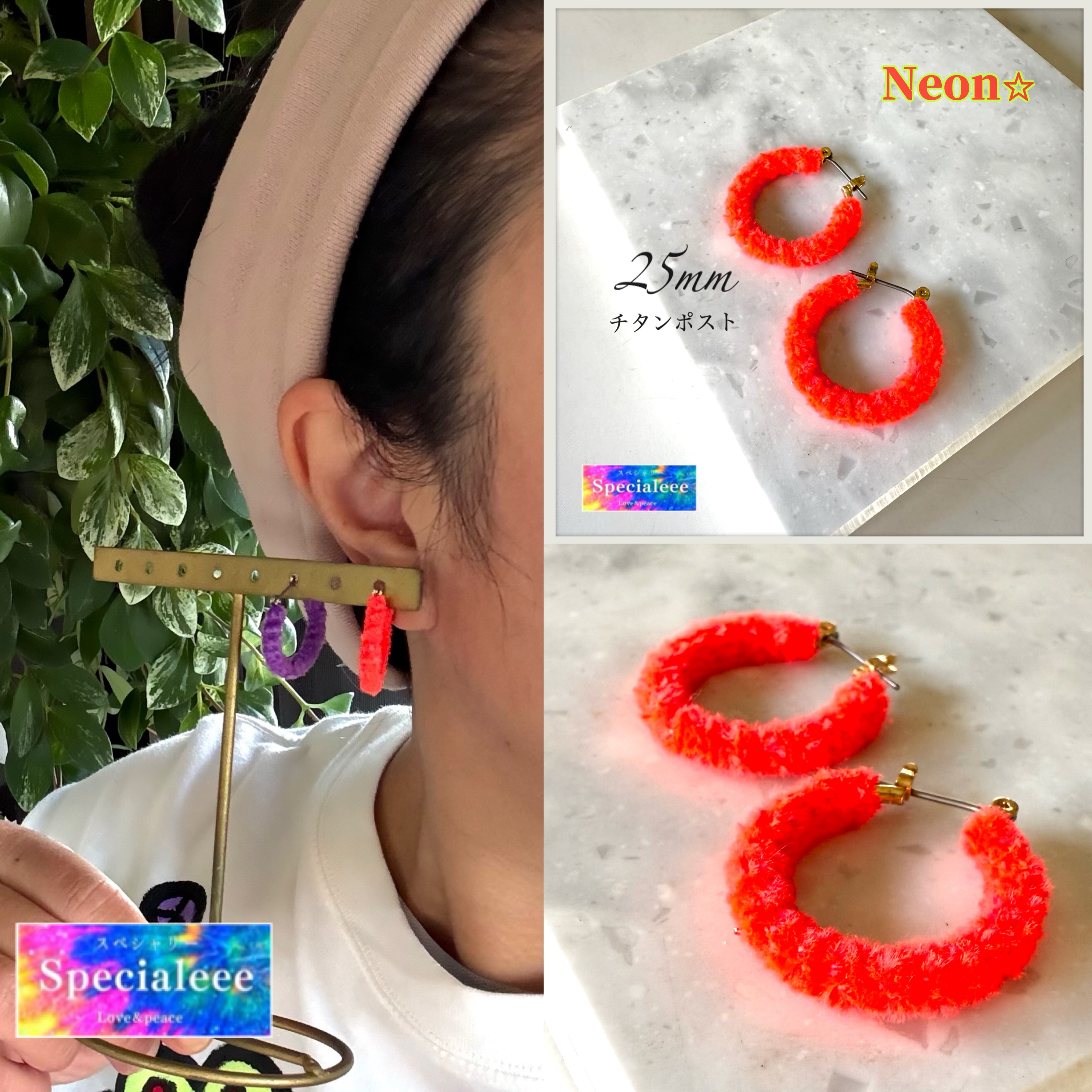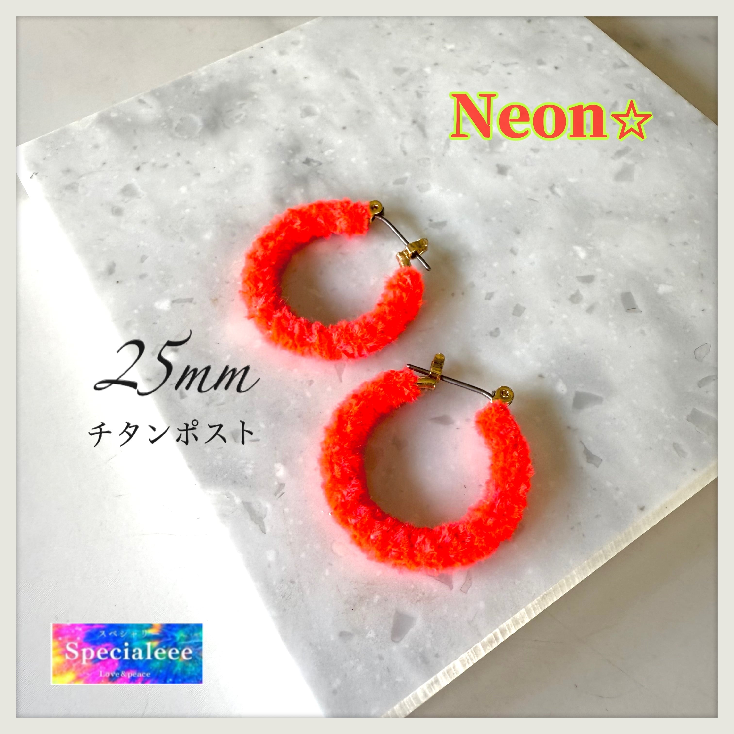 ネオンマジック★25mm蛍光オレンジ編みフープピアス★アレルギー対応チタンポスト★派手かわビビットカラー★目立つ★個性的★ワンポイント★