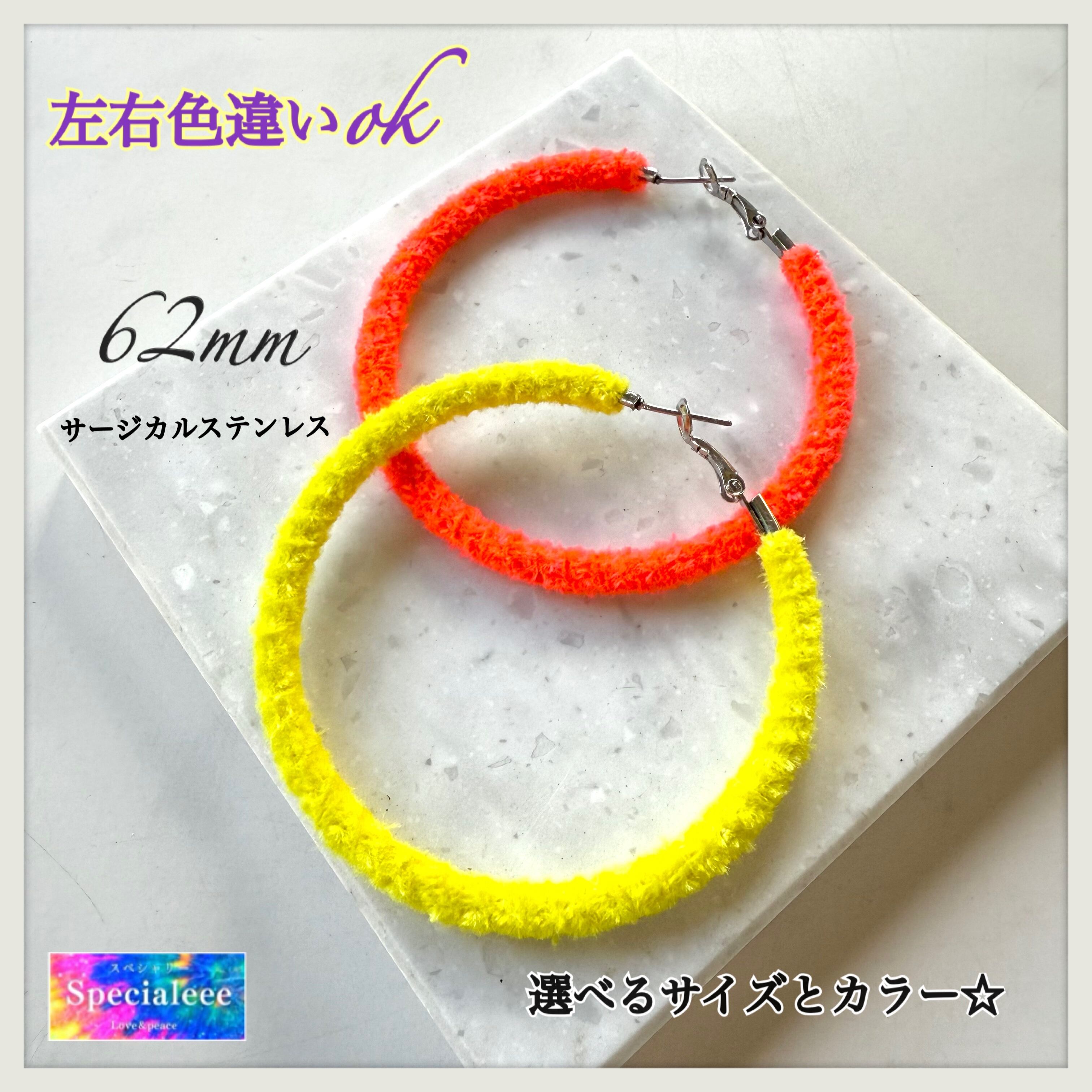 ネオンマジック★62mm色違いok蛍光カラー編みフープピアス★他にもカラーやサイズあります★イエロー&オレンジ★アレルギー対応サージカルステンレス★