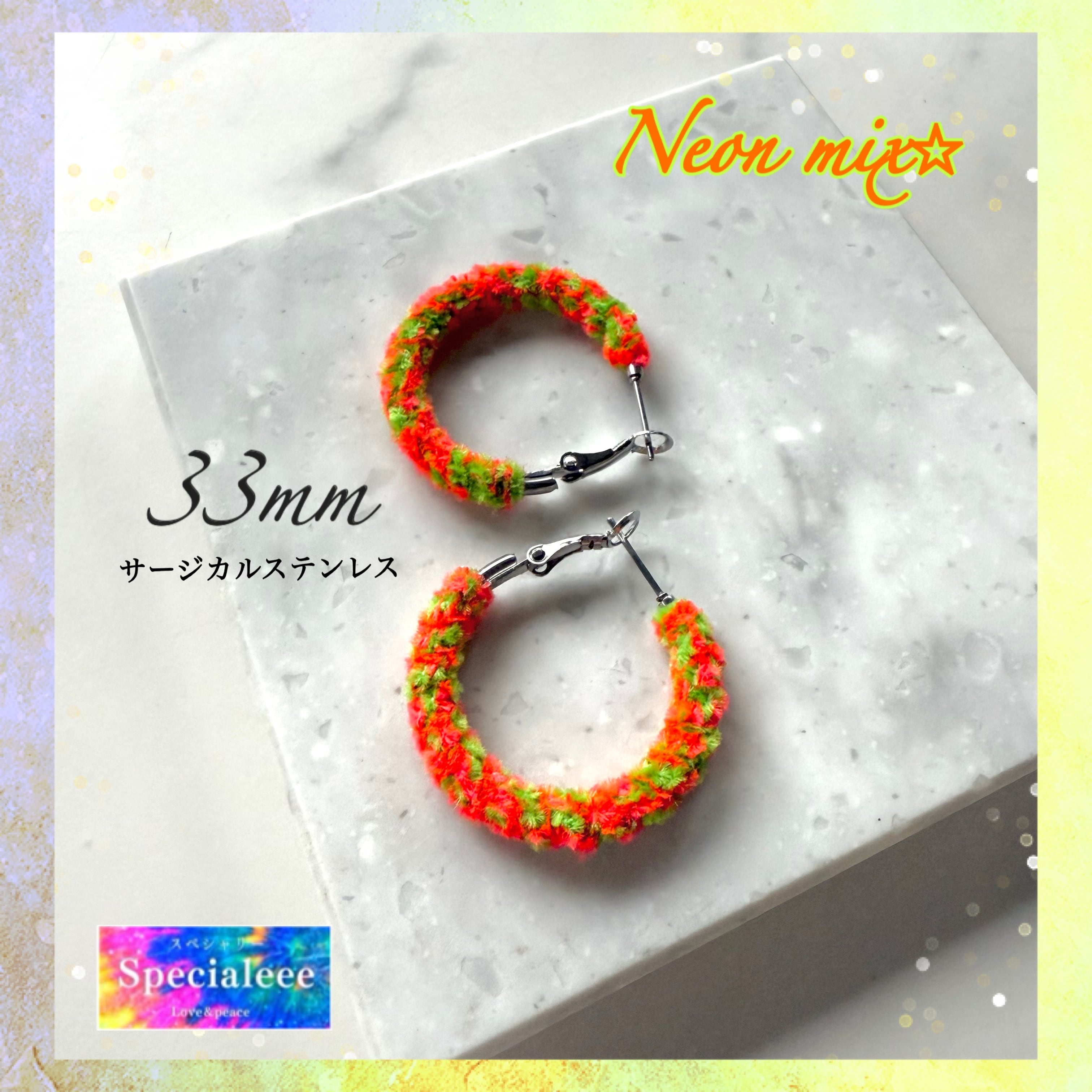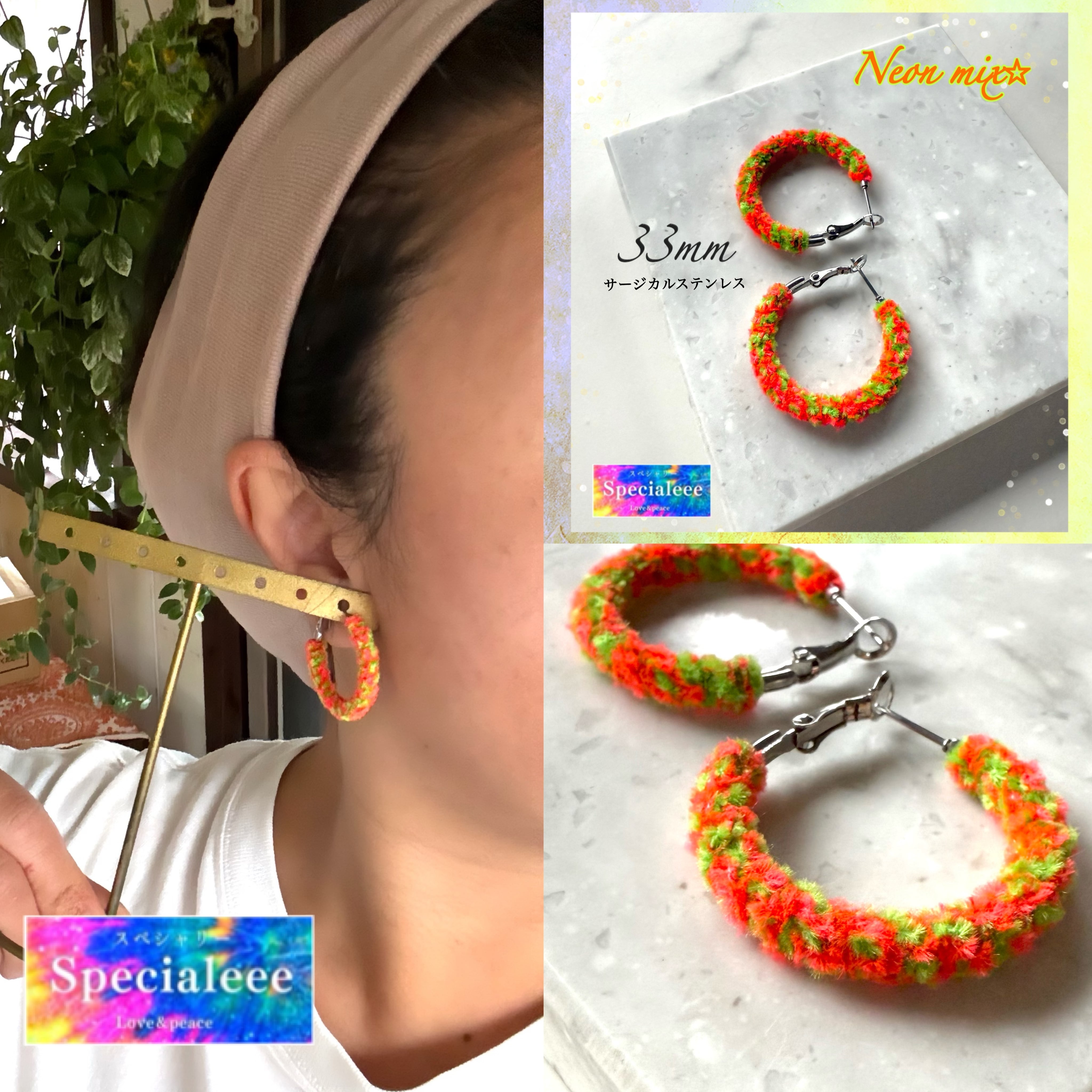 ネオンマジック★33mm蛍光グリーン&オレンジ編みフープピアス★アレルギー対応サージカルステンレス★サイズやイヤリング変更もok★派手かわビビット★
