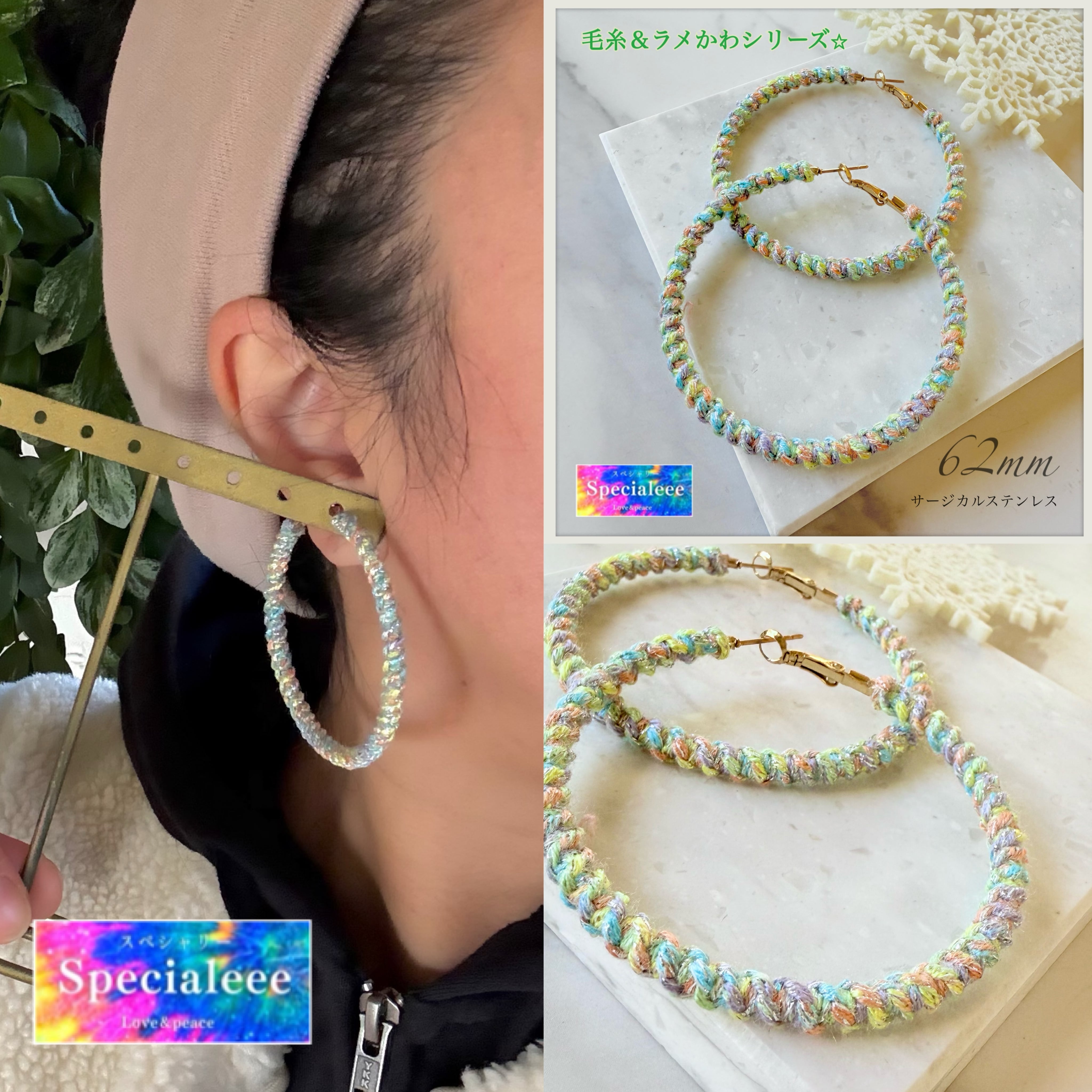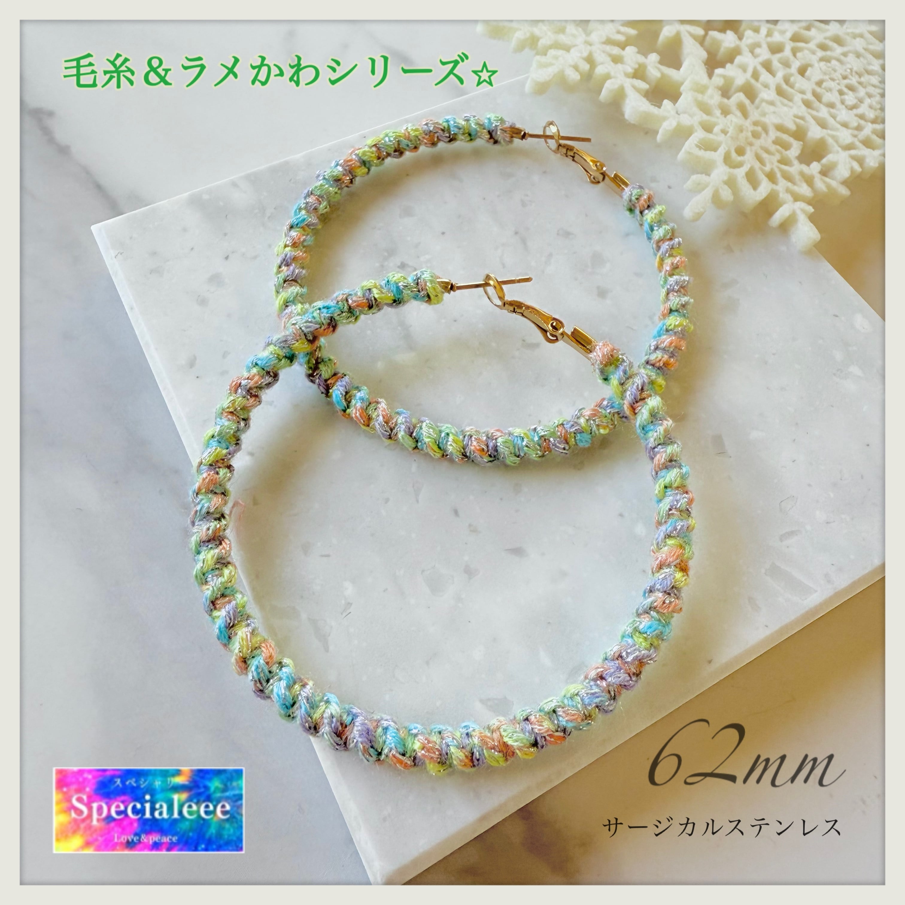 62mm★毛糸&ラメシリーズ★カラフルパステル編みフープピアス★サージカルステンレス★サイズ変更★イヤリングok★
