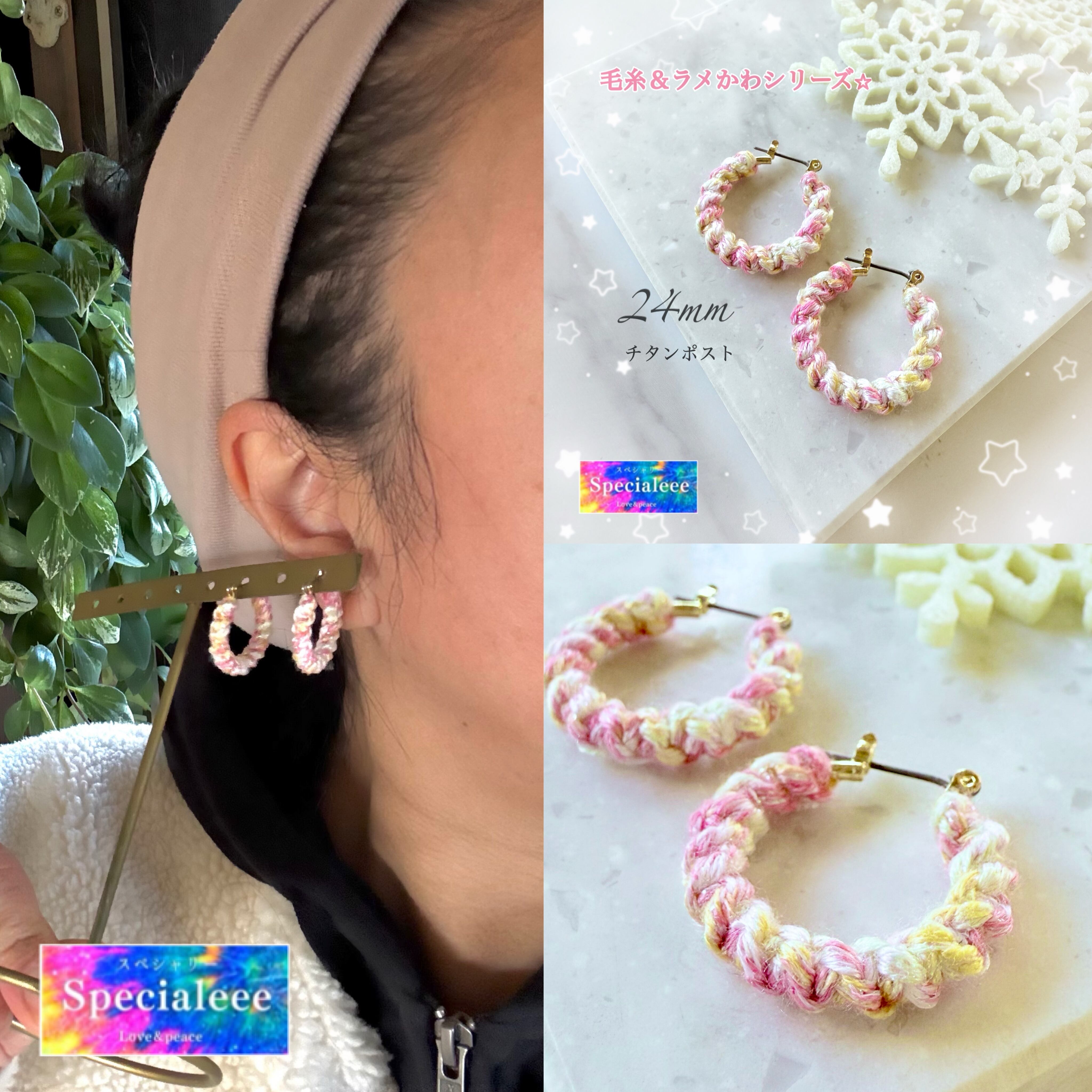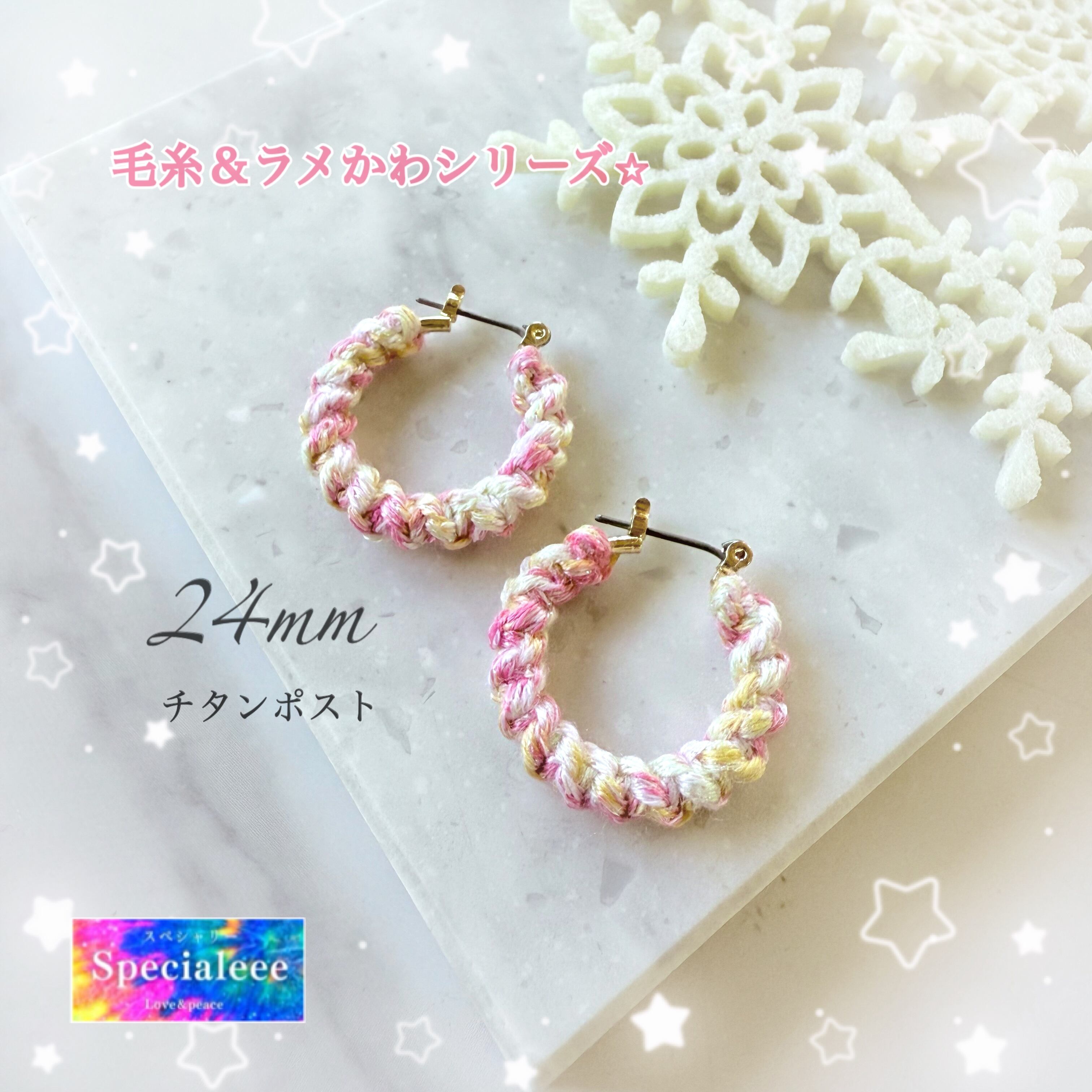 24mm★毛糸&ラメ編みシリーズ★可愛いピンク&バターイエローフープピアス★冬素材感★チタンポスト★