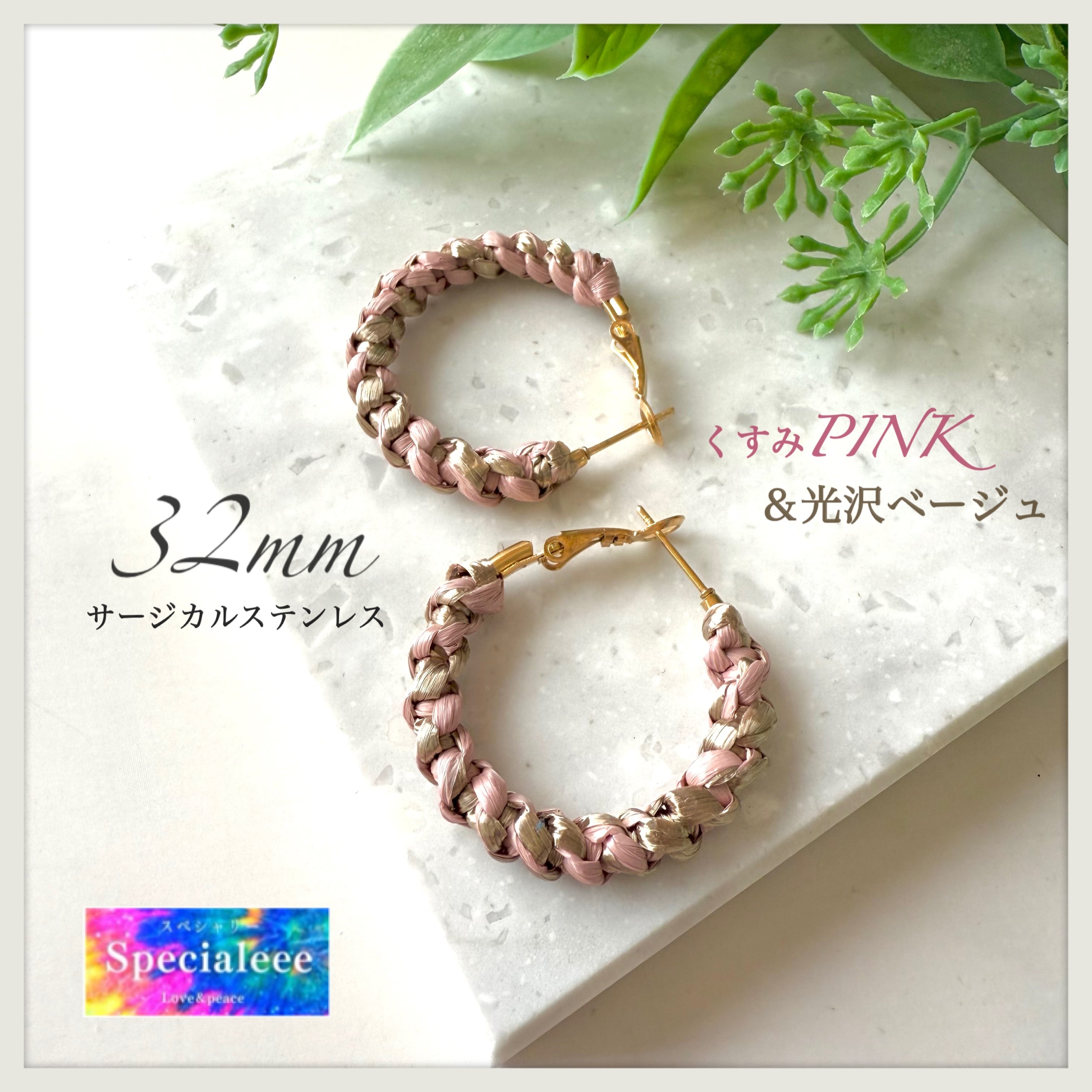 32mm★大人気くすみピンク&光沢ベージュゴールド編みフープピアス★大人可愛い★お洒落個性★グレージュ★アレルギー対応サージカルステンレス★
