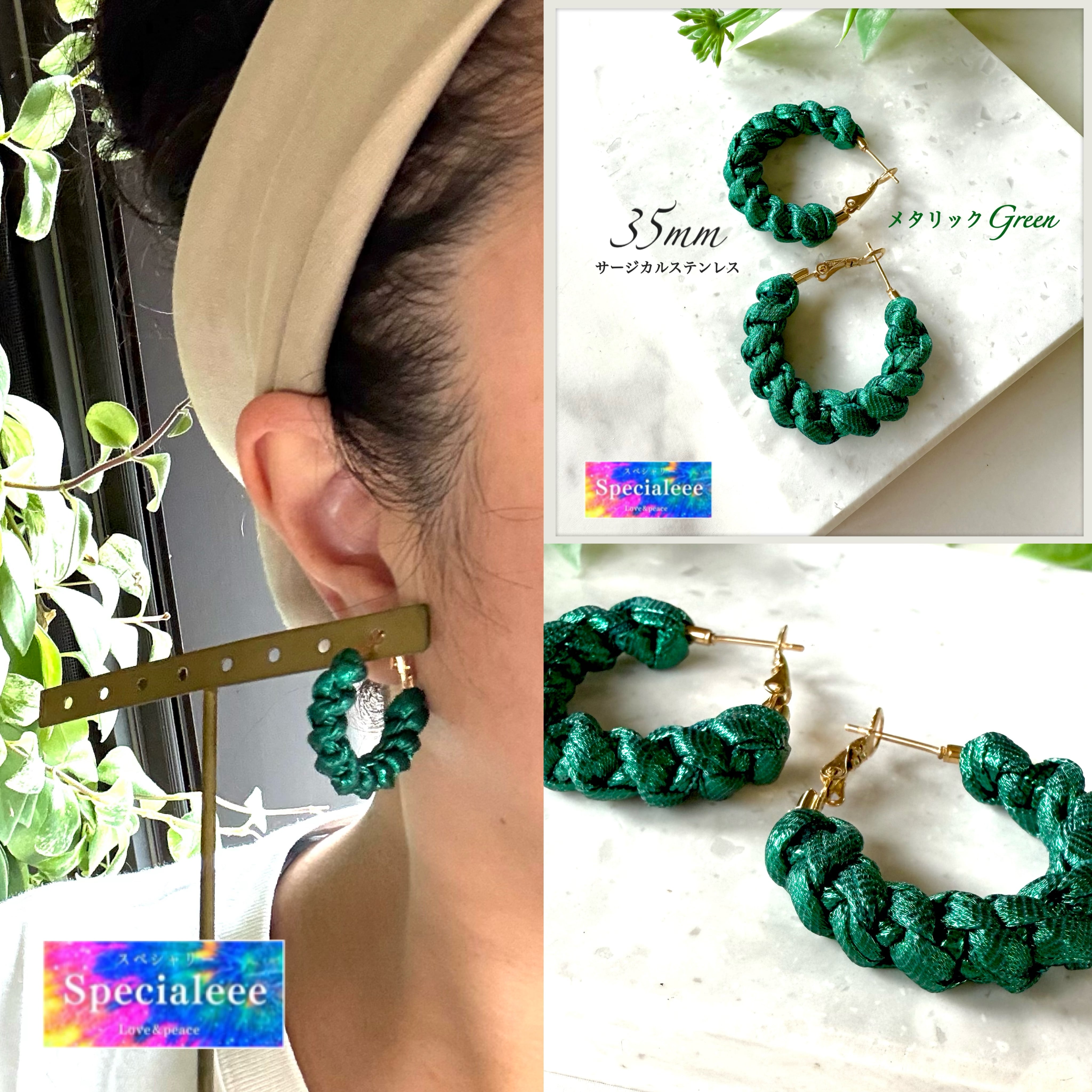 34mm★メタリック緑グリーン太編みフープピアス★存在感と個性★アレルギー対応サージカルステンレス★