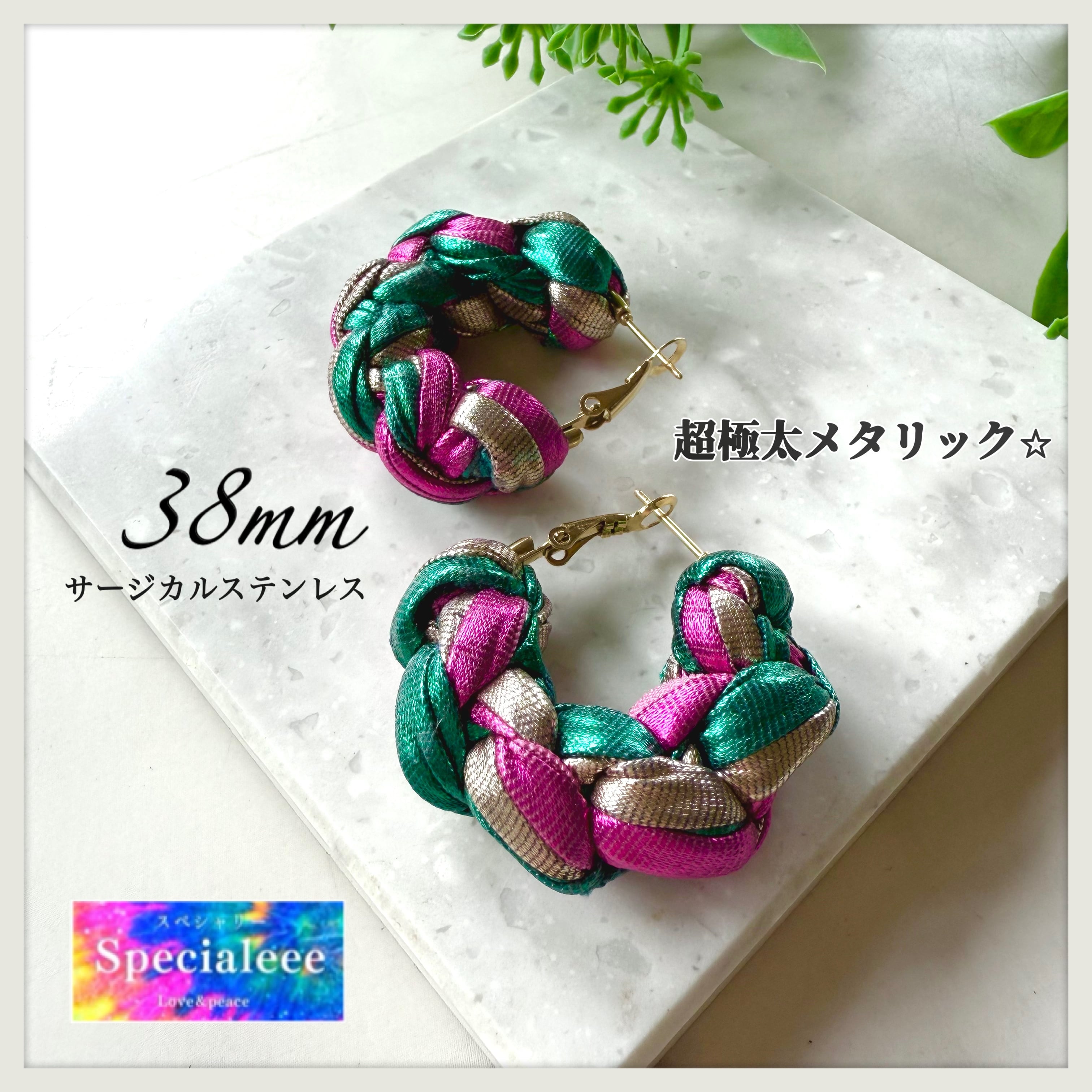超極太インパクトシリーズ★38mmメタリックフープピアス★派手可愛いチャンキー★グリーンゴールドピンク★アレルギー対応サージカルステンレス★