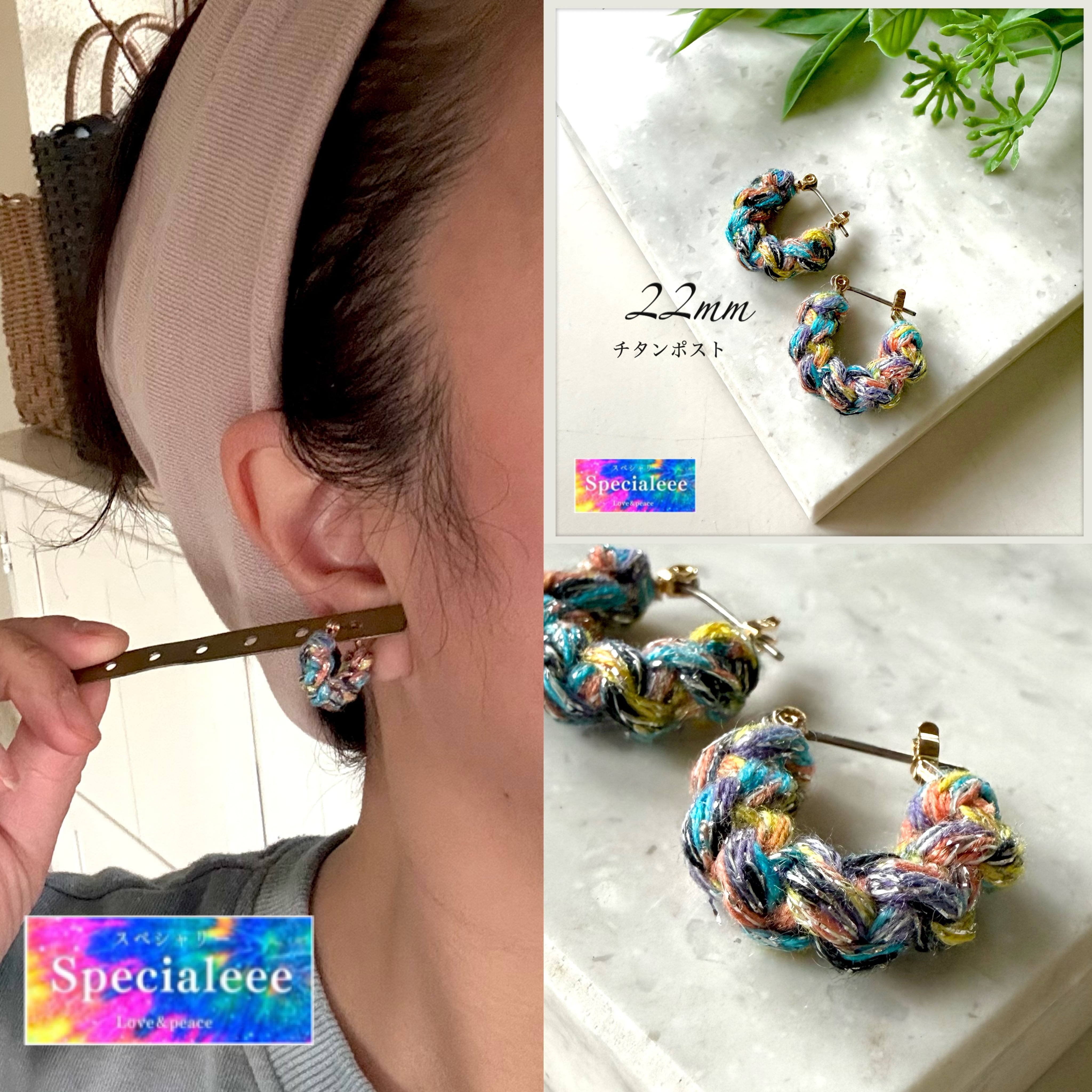 太めに3本どりで編んだカラフル毛糸ピアス★