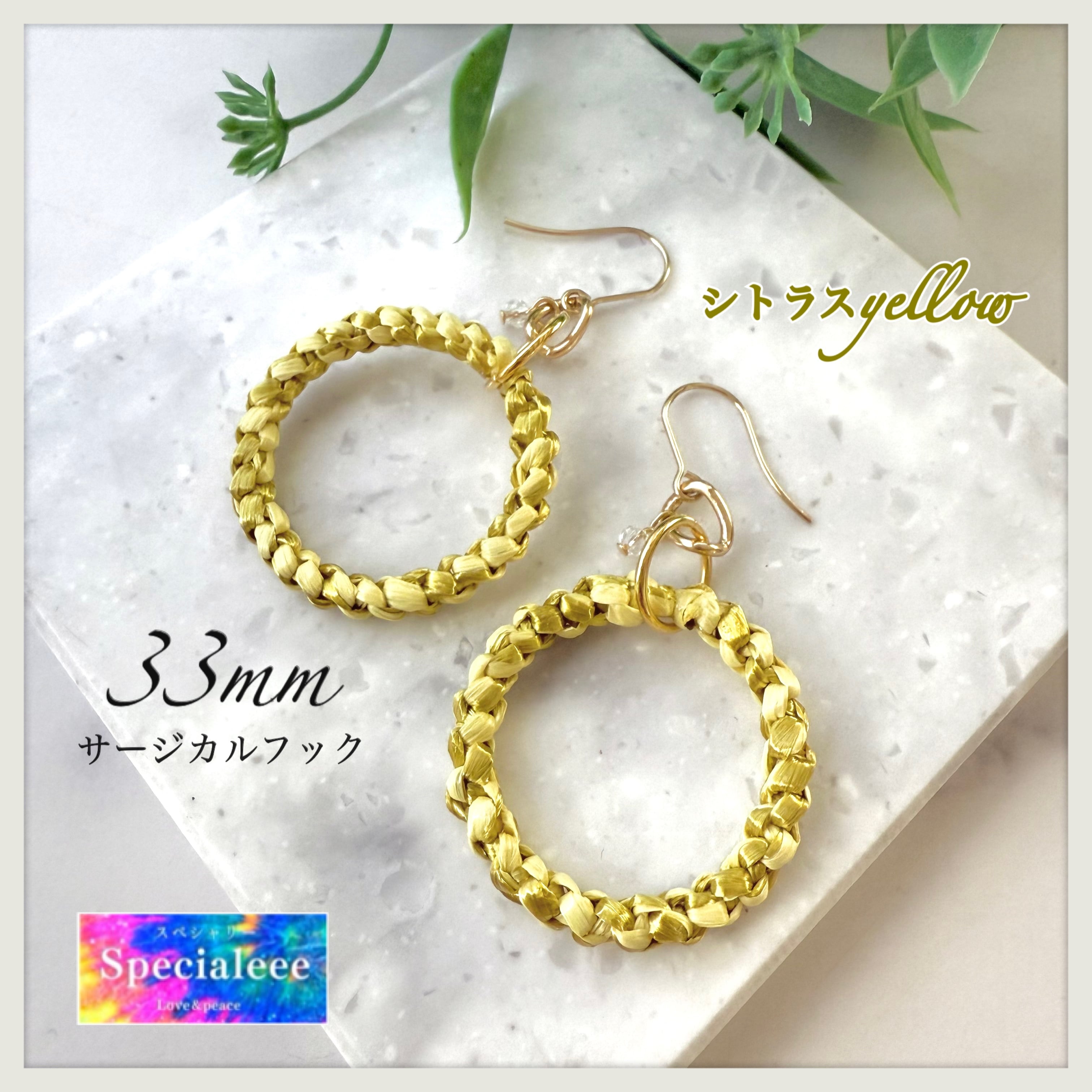 33mm★2色イエローミックス編み揺れるリングピアス★ミニキラキラビーズ★シトラス黄色★サージカルフック★ネジイヤリング無料付け替え★