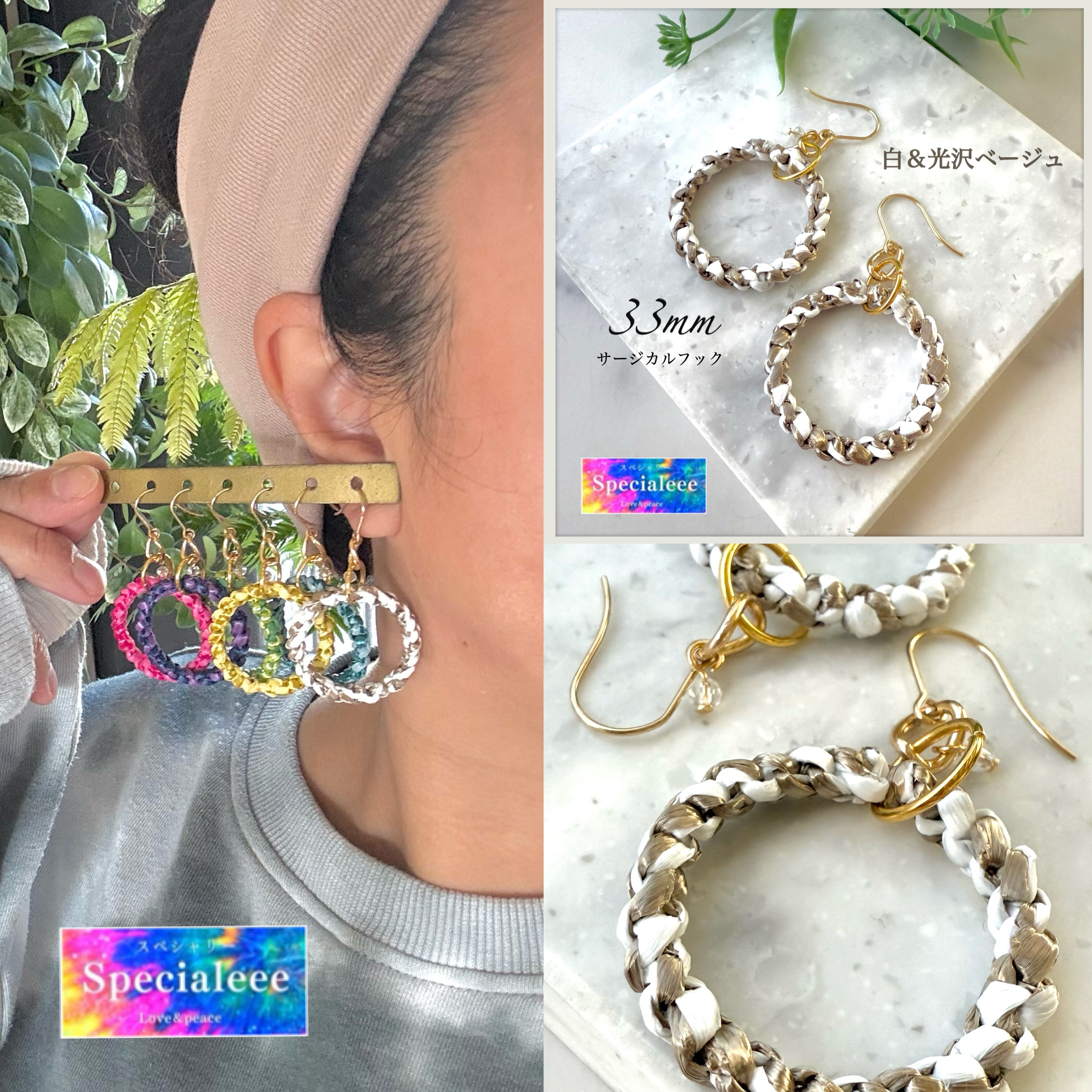 33mm★2色ホワイト&光沢ベージュ編み揺れるリングピアス★サージカルフック★ネジイヤリング無料付け替え★白ゴールド★キラキラビーズ★