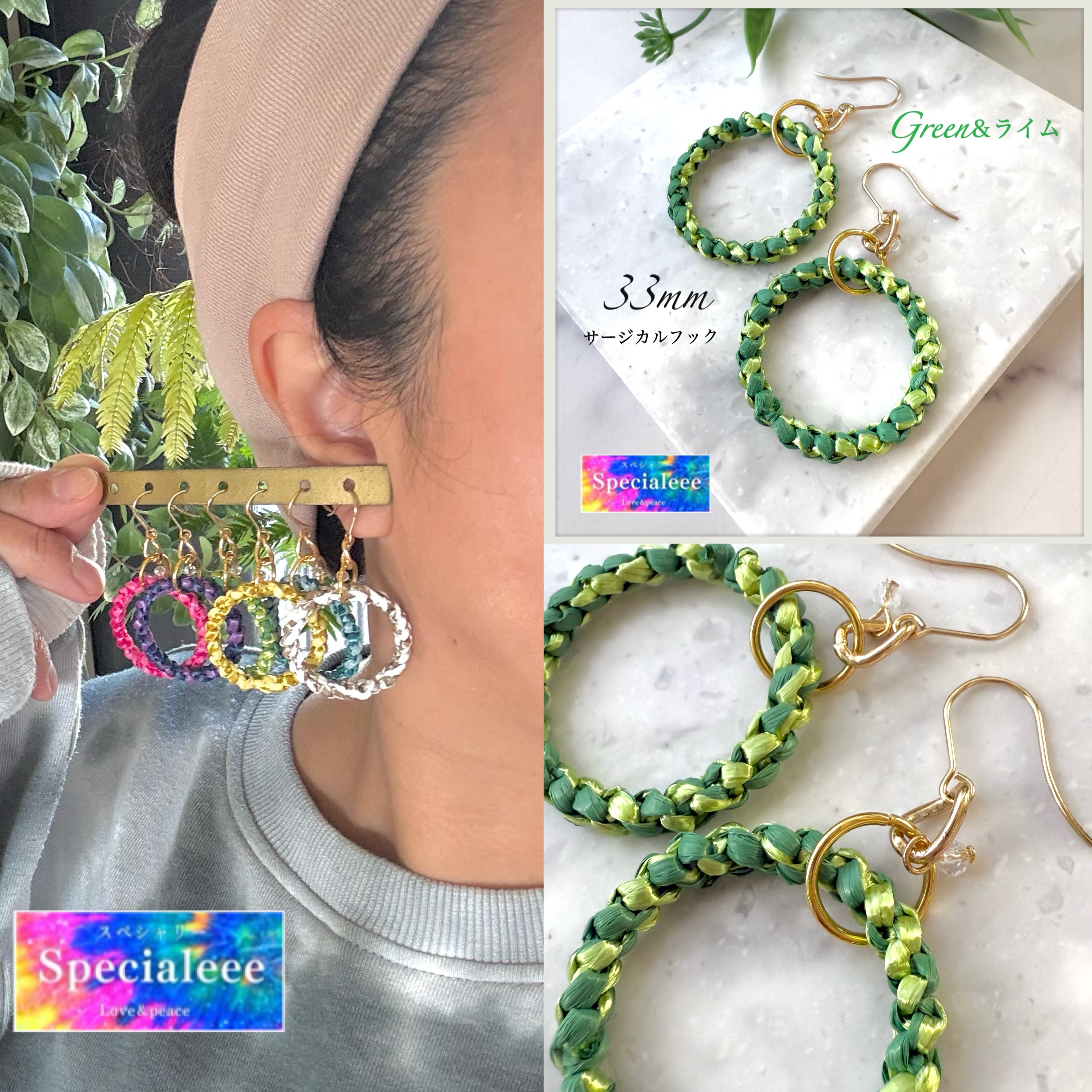 33mm★2色グリーン&光沢ライム編みリングピアス★サージカルフック★ネジイヤリング無料★緑★黄緑★カラー★