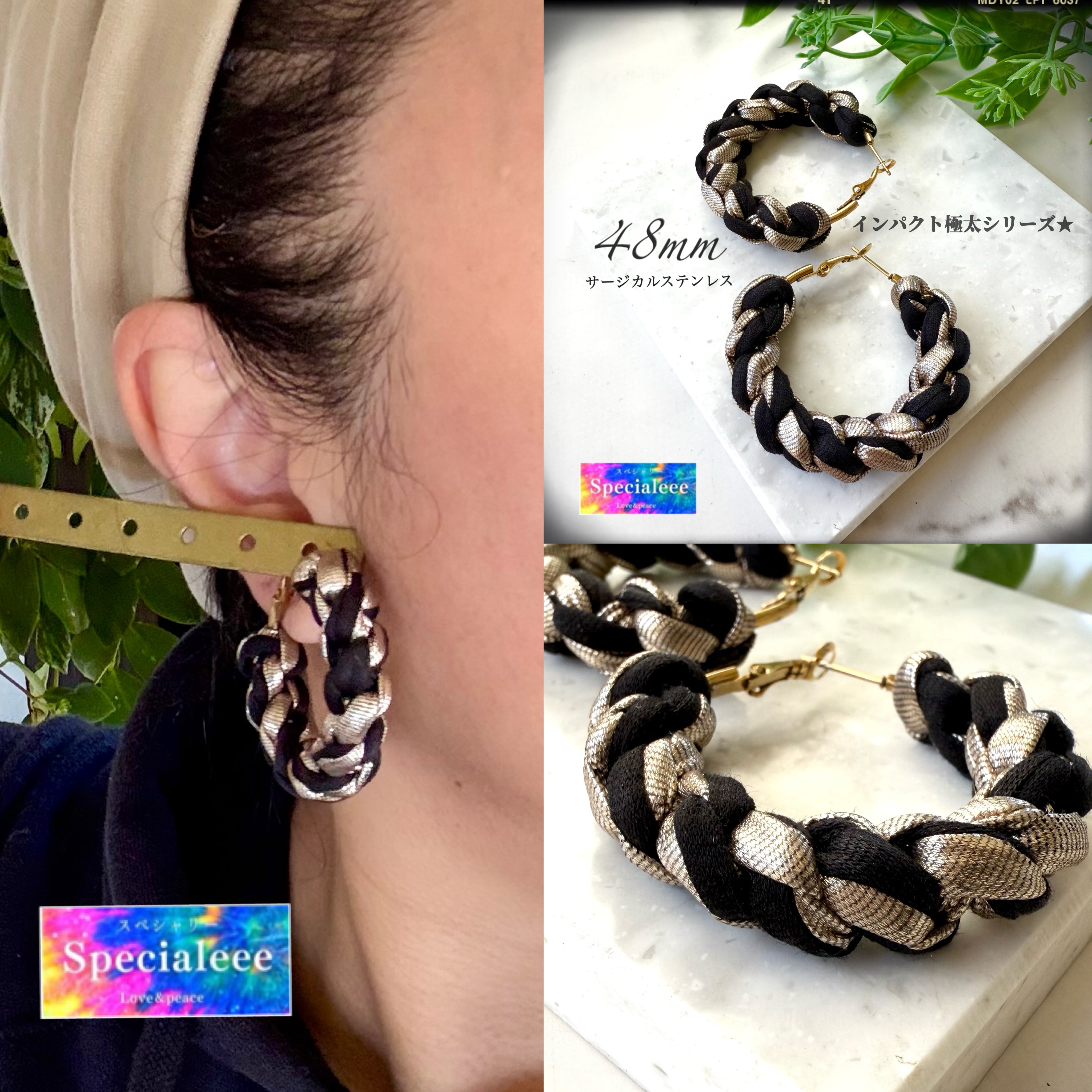 48mm★インパクト極太黒&メタリックゴールド編みフープピアス★アレルギー対応サージカルステンレス★黒★個性的★