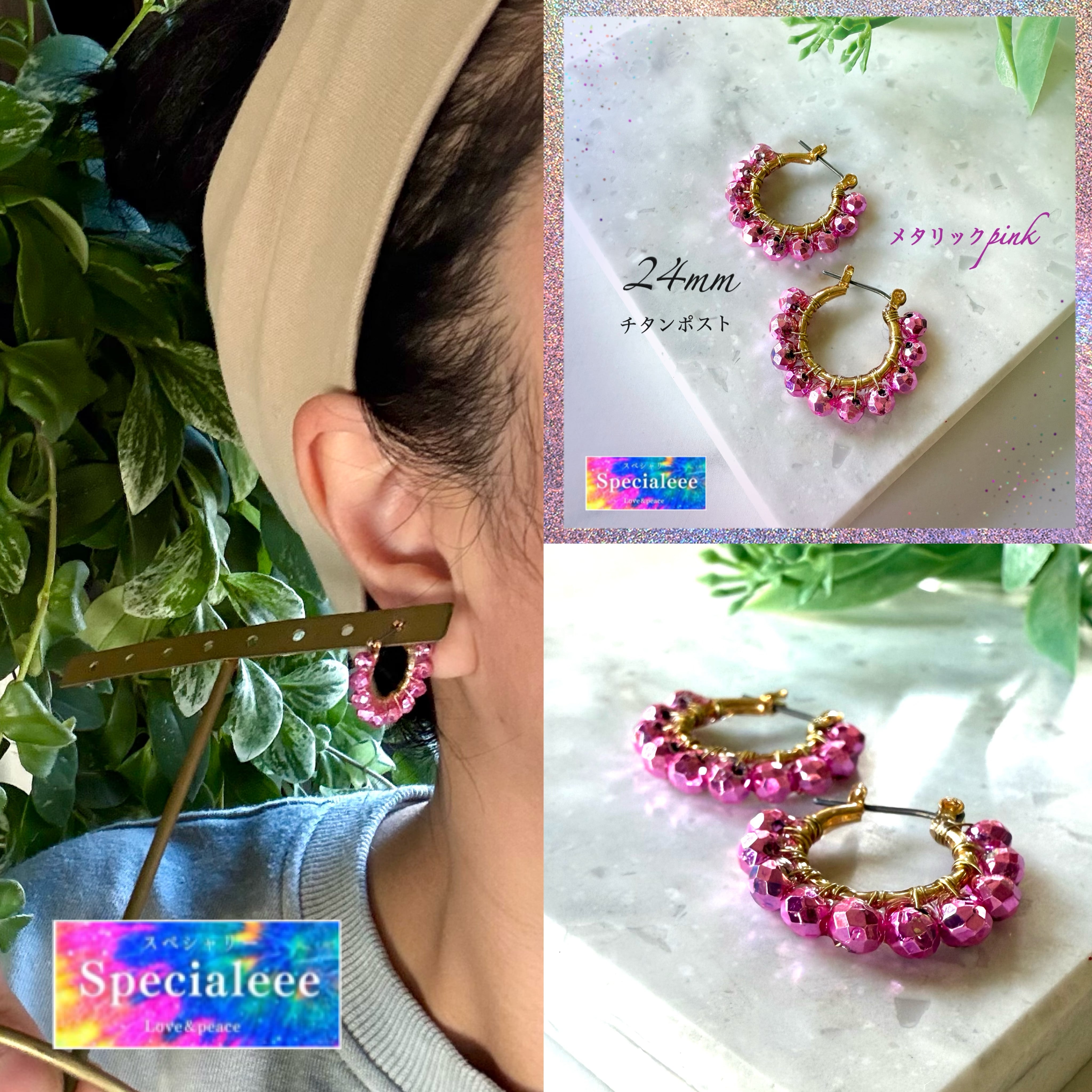 24mm★メタリックピンク派手かわフープピアス★アレルギー対応チタンポスト★ギラギラ派手pink★