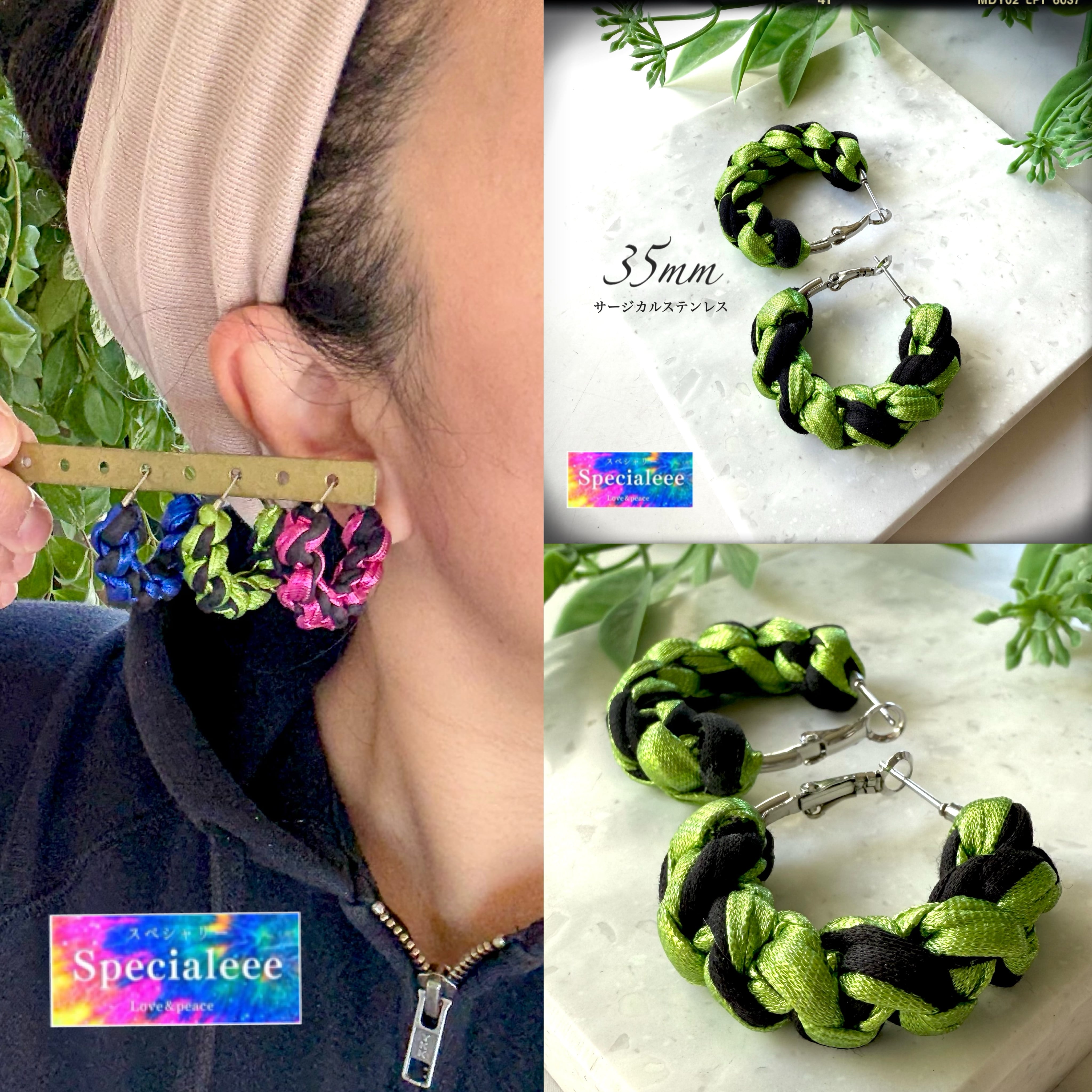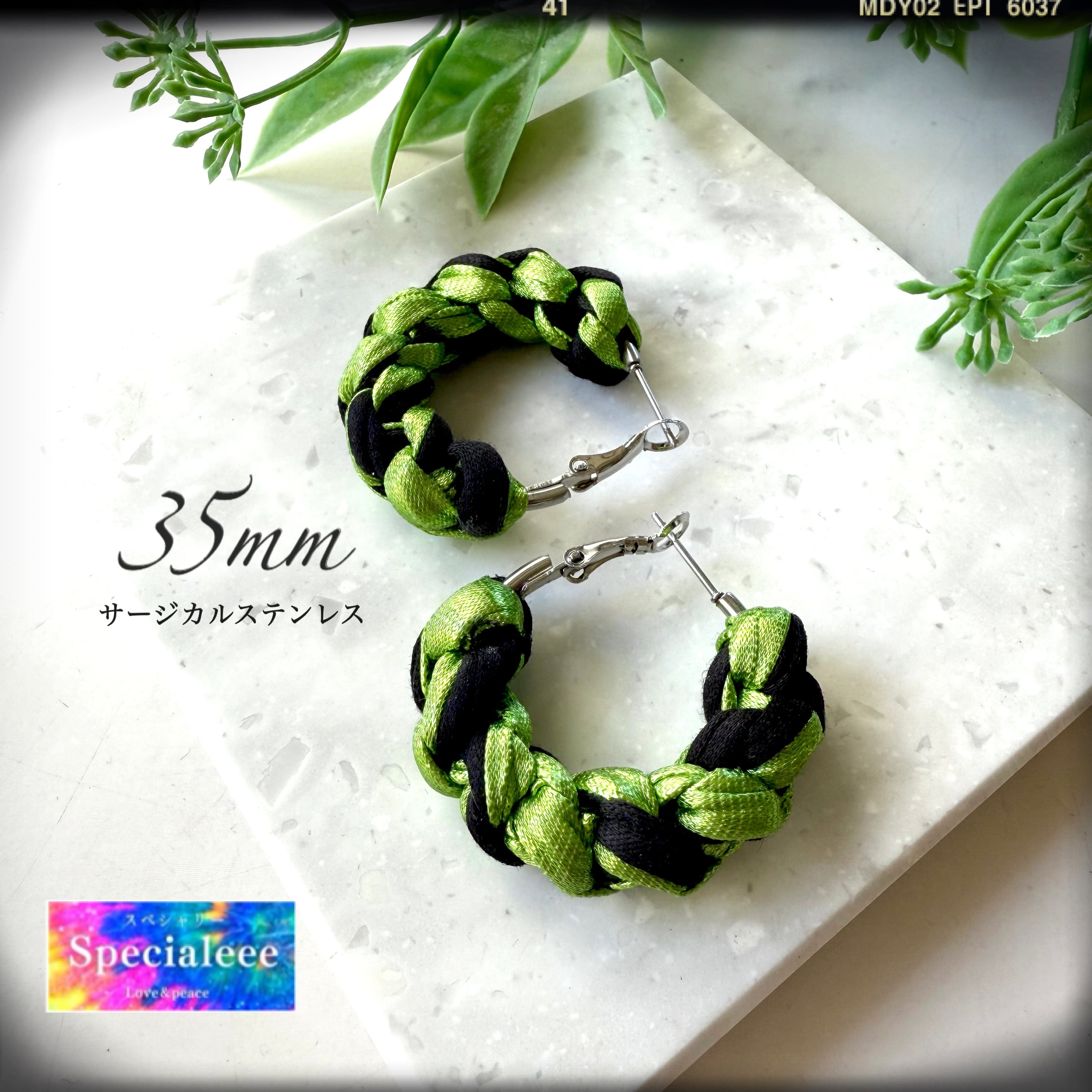 35mm★黒&メタリック黄緑の太編みチャンキーフープピアス★派手可愛い★アレルギー対応サージカルステンレス★ライトグリーン★