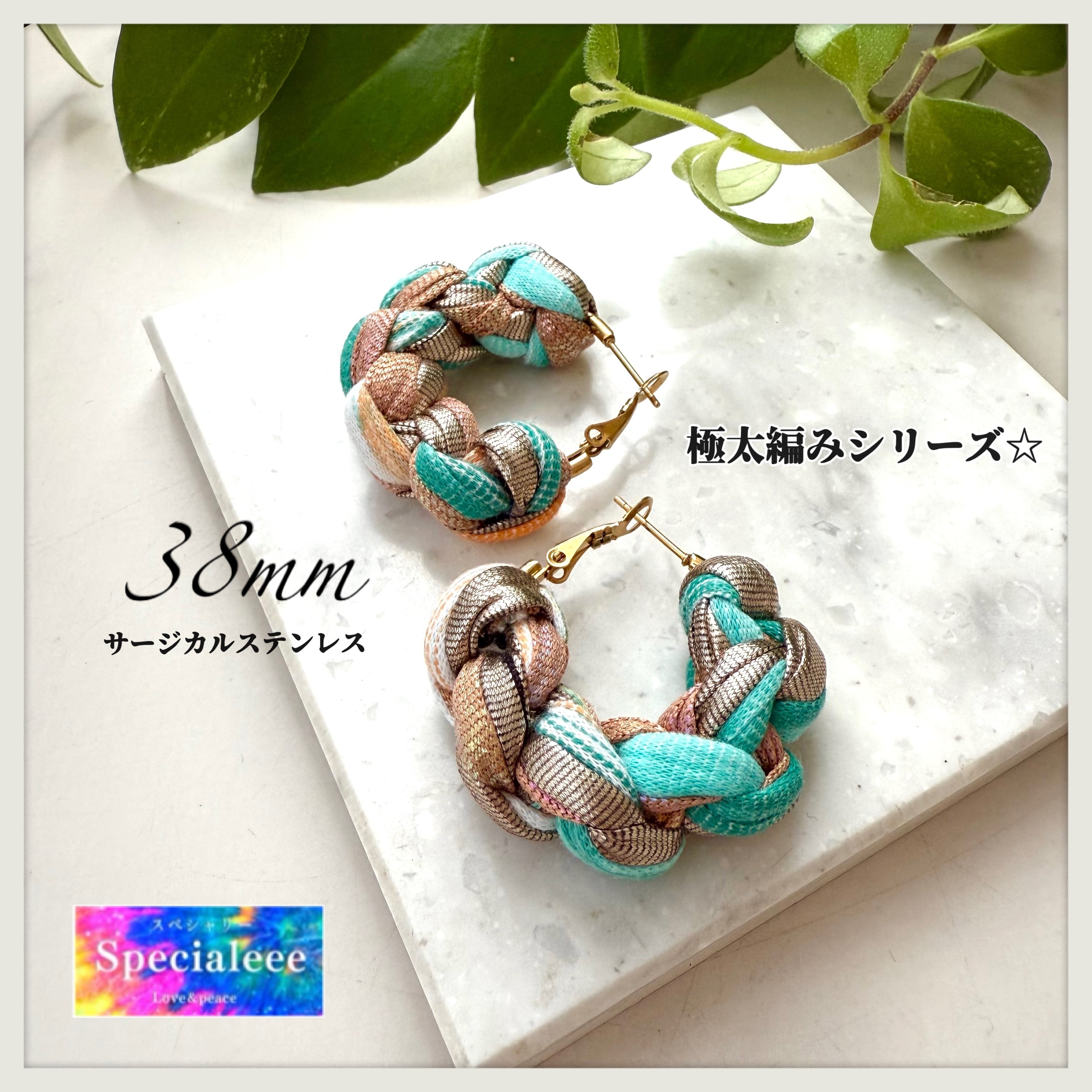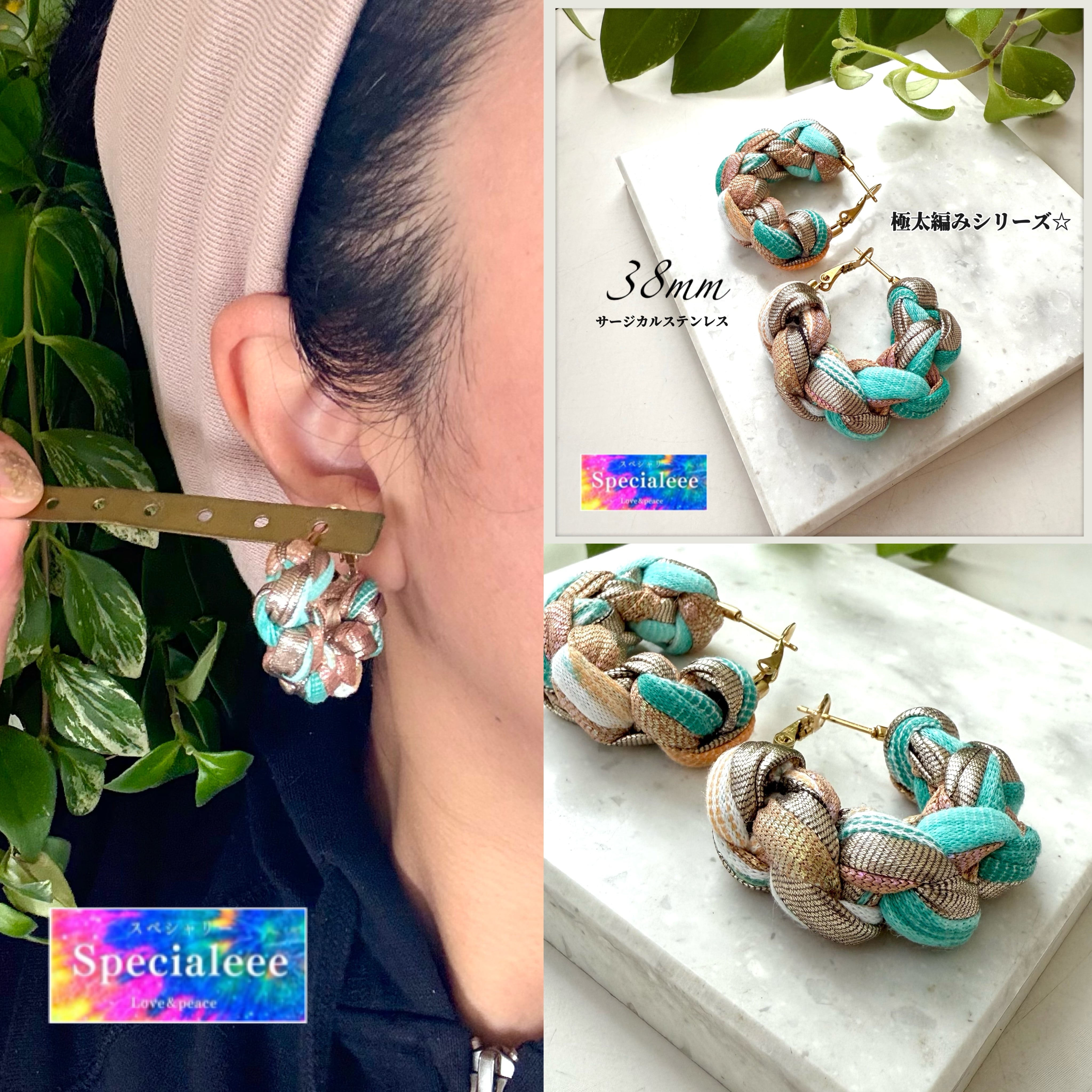 38mm★3色極太編みチャンキーフープピアス★ターコイズ&メタリックゴールド&ラメベージュ★インパクトと存在感★アレルギー対応サージカルステンレス☆