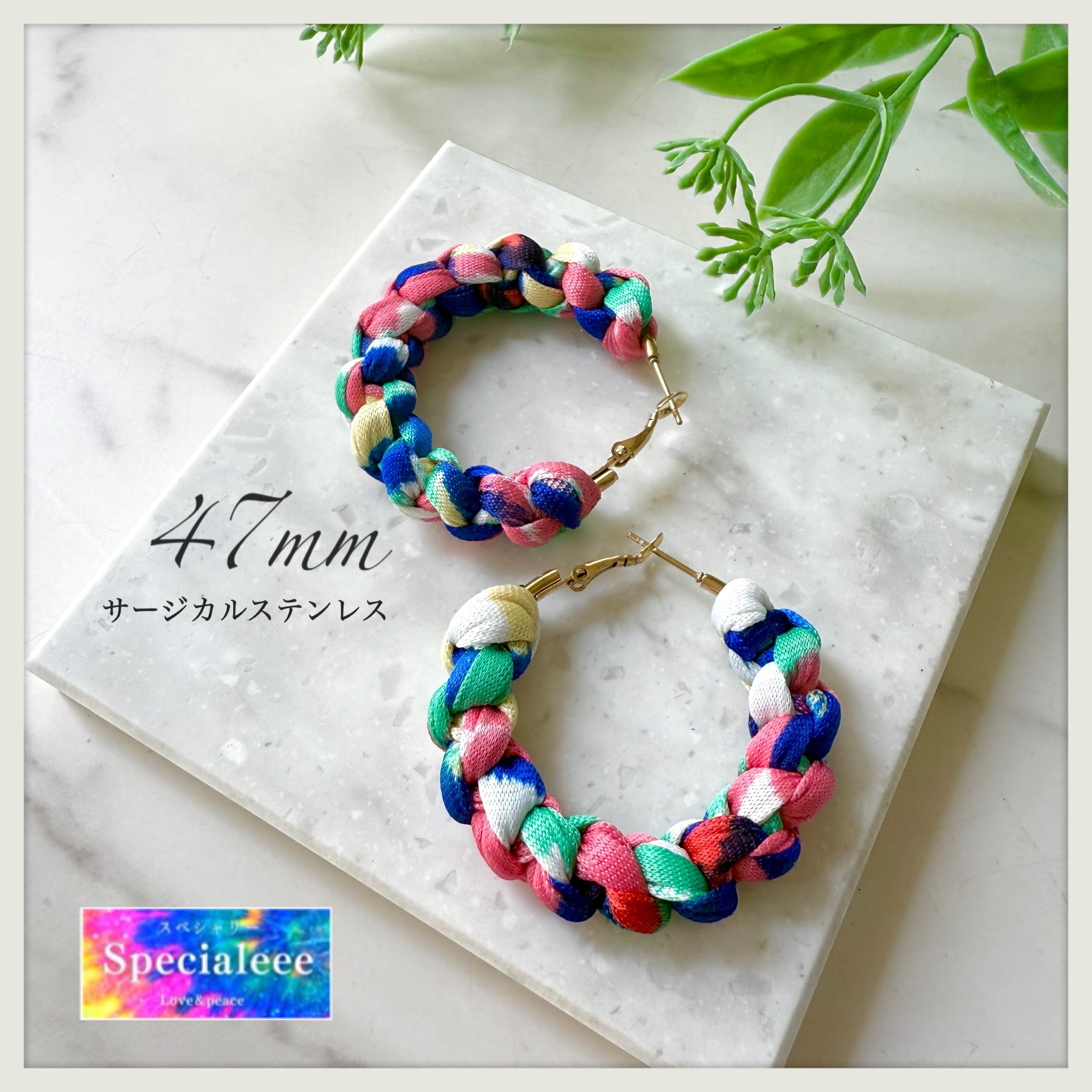 47mm★春夏カラフル太編みフープピアス★アレルギー対応サージカルステンレス★派手可愛い★