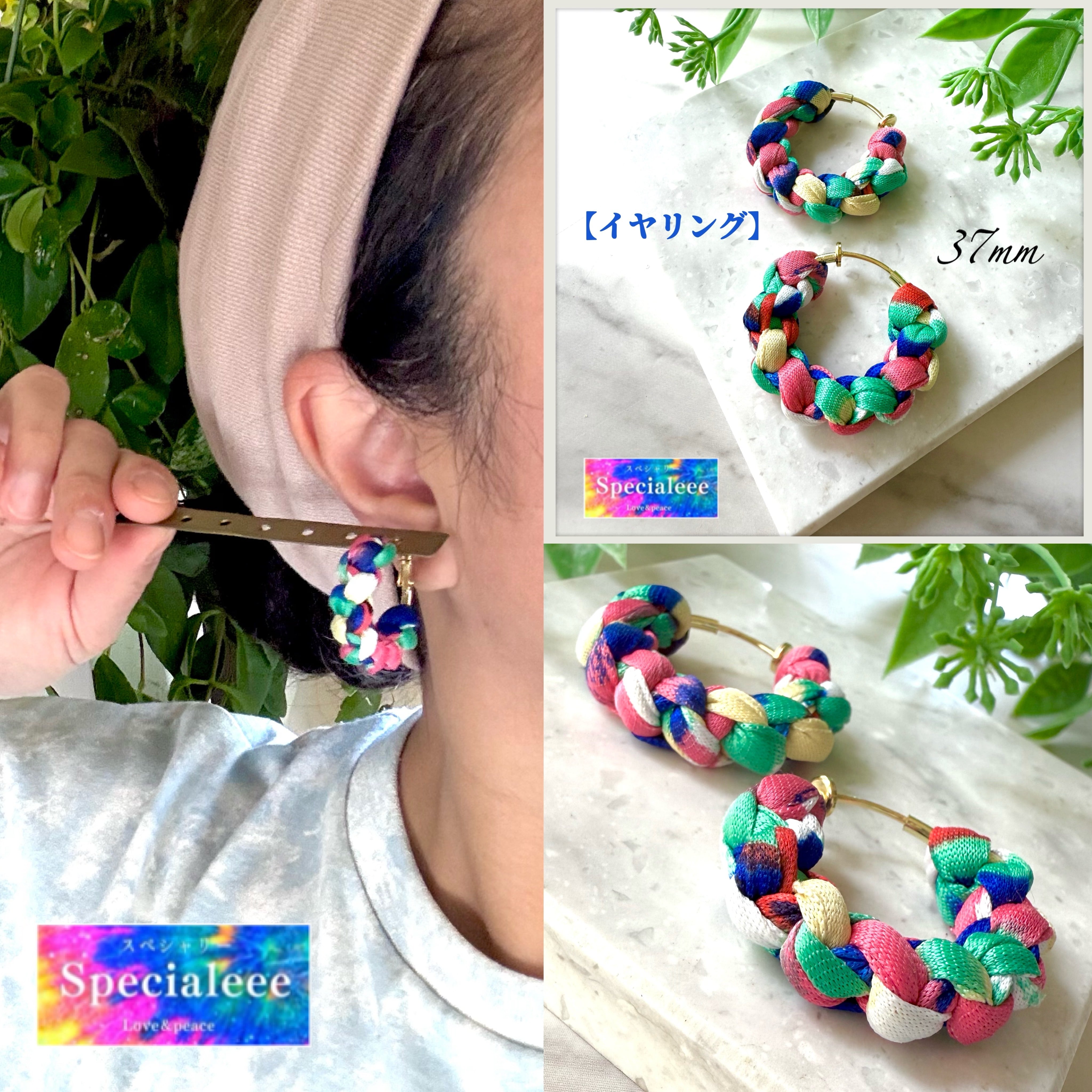 【イヤリングページ】37mm★春夏カラフル太編みフープ★ピアスに見えるイヤリング★派手可愛い★軽い★肌に優しい★