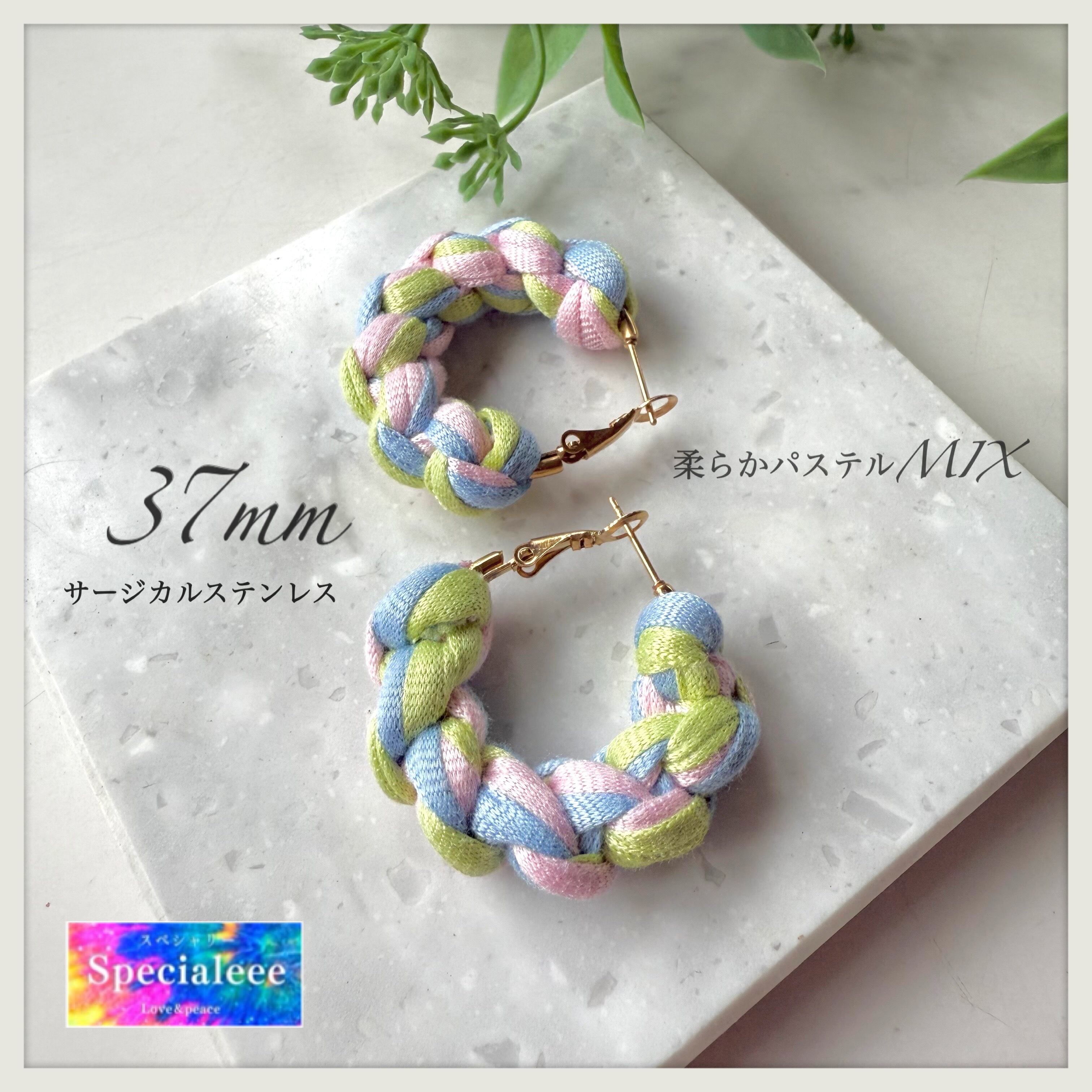 37mm★柔らかパステルカラーミックス太編みフープピアス★アレルギー対応サージカルステンレス★パステルブルー★ピンク★ライムグリーン★可愛い★