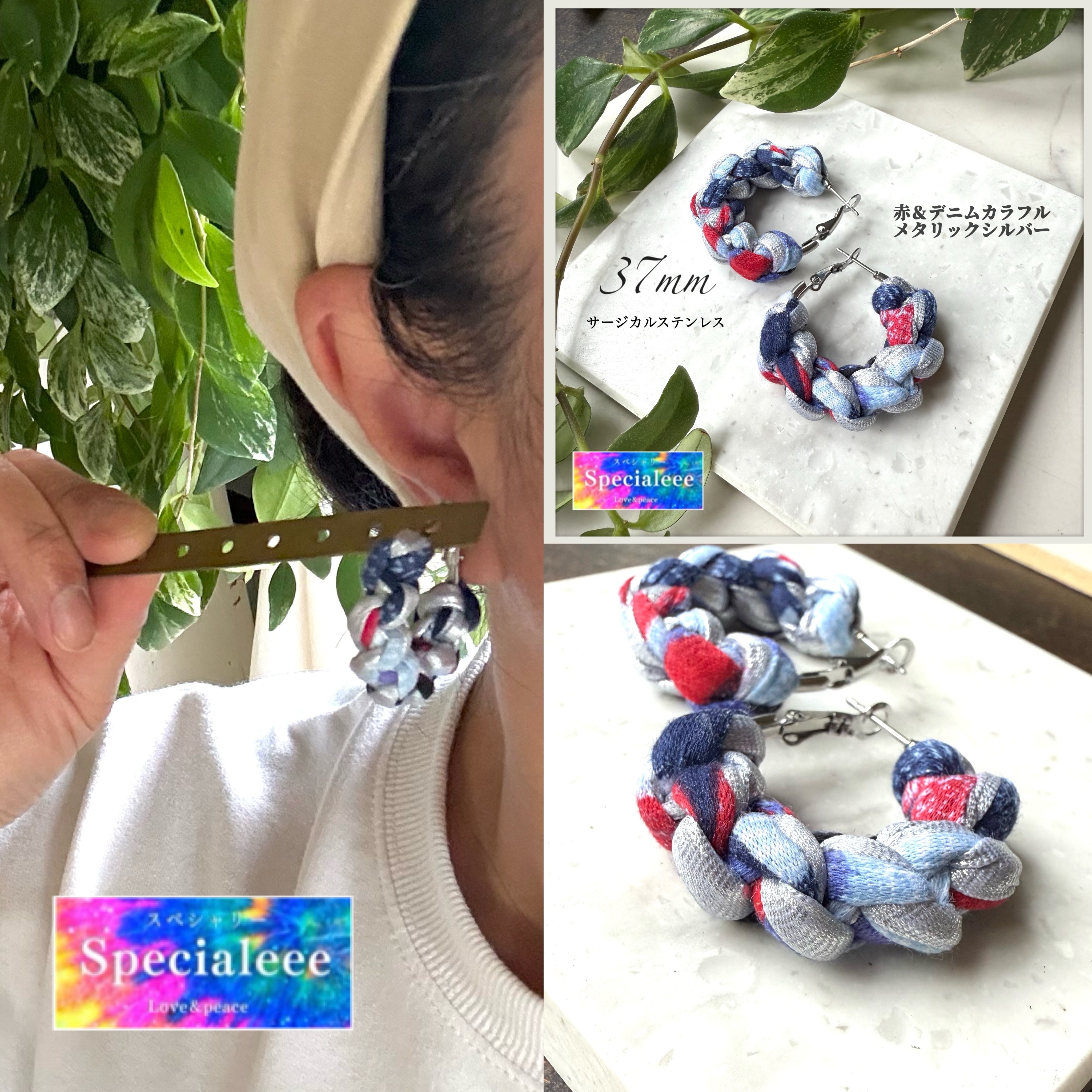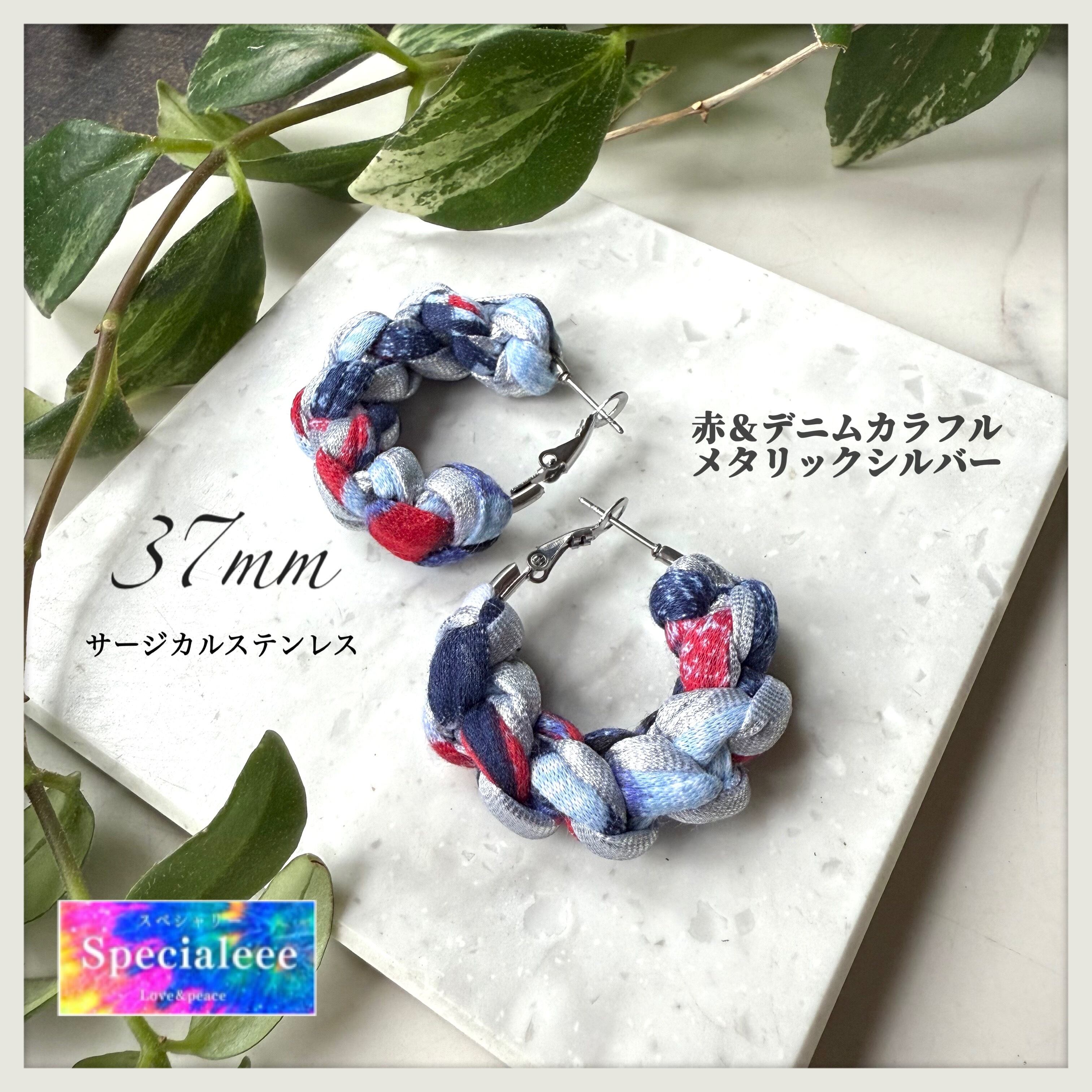 37mm★赤入りデニムカラー&メタリックシルバー太編みフープピアス★軽い★アレルギー対応サージカルステンレス★
