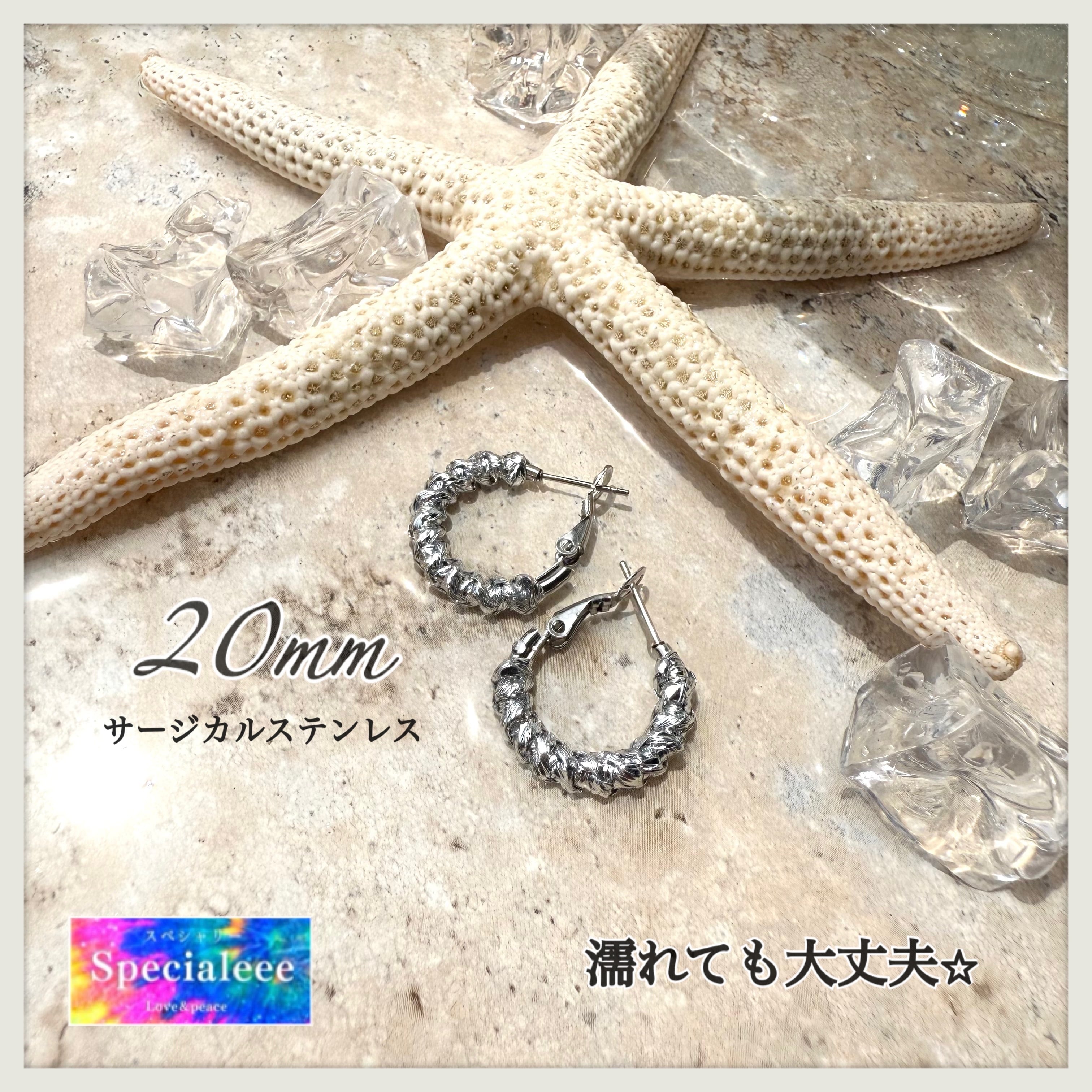 濡れてもok★20mmメタリックシルバー編み小さめフープピアス★存在感★アレルギー対応で錆びに強いサージカルステンレス★海川★夏★スポーツ★