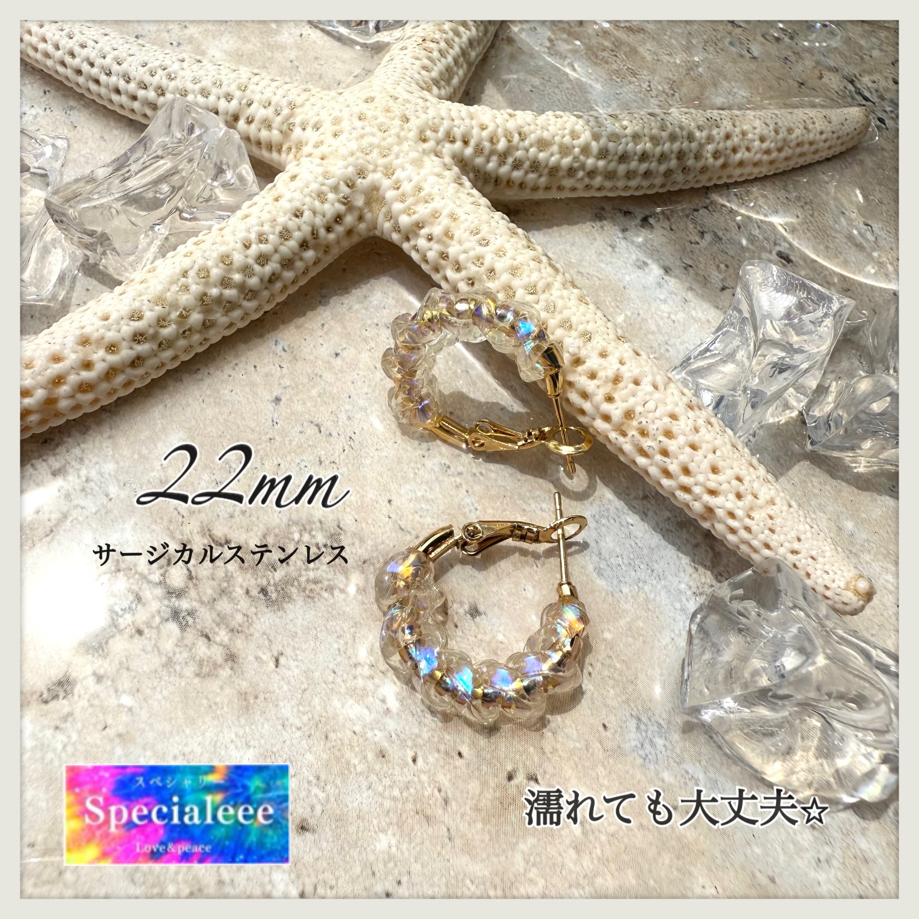 濡れてもok★22mmオーロラシャボン玉クリアフープピアス★透け感と存在感★アレルギー対応と錆に強いサージカルステンレス★夏★煌めき★海川スポーツ★