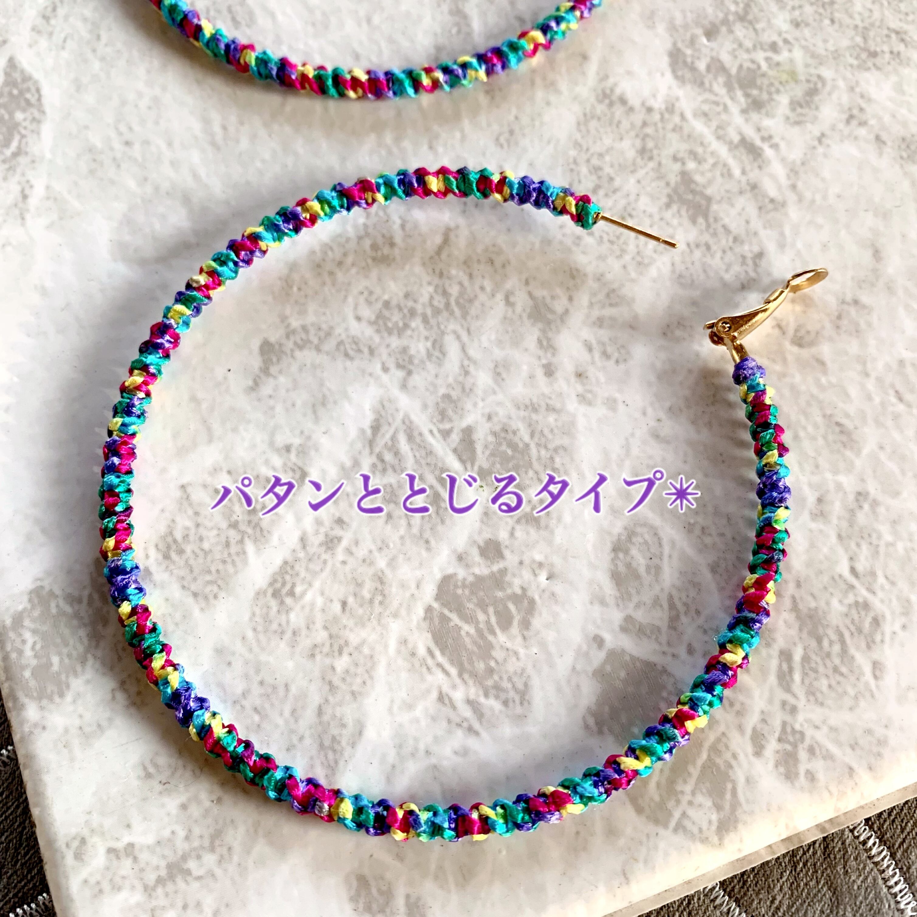 【サージカルステンレス】待望の80mm!メタリックレインボー編みフープピアス 虹色 BIG 大きいサイズ 手編みオリジナル ゴールド シルバーok 派手 個性 カラフル ハンドメイドアクセサリー