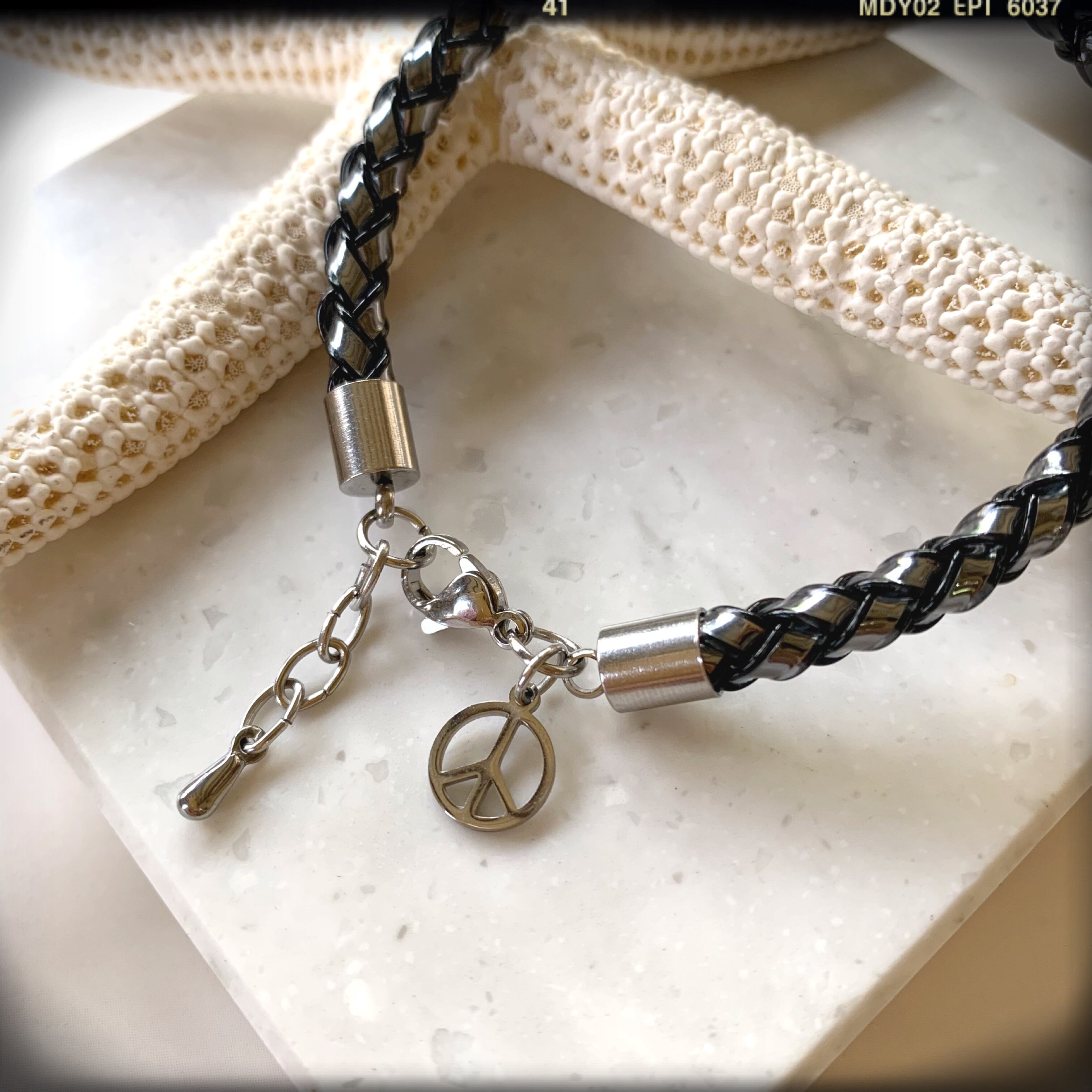 濡れてok!アレルギー対応サージカルステンレス防水ブレスレットブラックメタル★黒 グレー メタリック 手編み オリジナル メンズ レディース ユニセックス お揃い ペア ハンドメイドアクセサリー