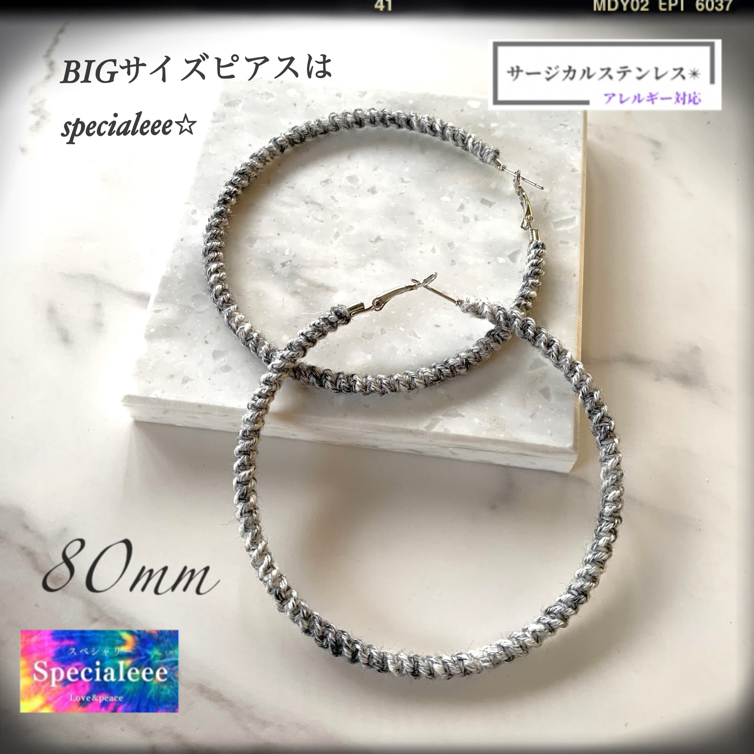 80mm★サージカルステンレスBIGフープピアス★グレー&ブラック編み★金属アレルギー対応★スタイリッシュ★お洒落★ハンドメイドアクセサリーspecialeee