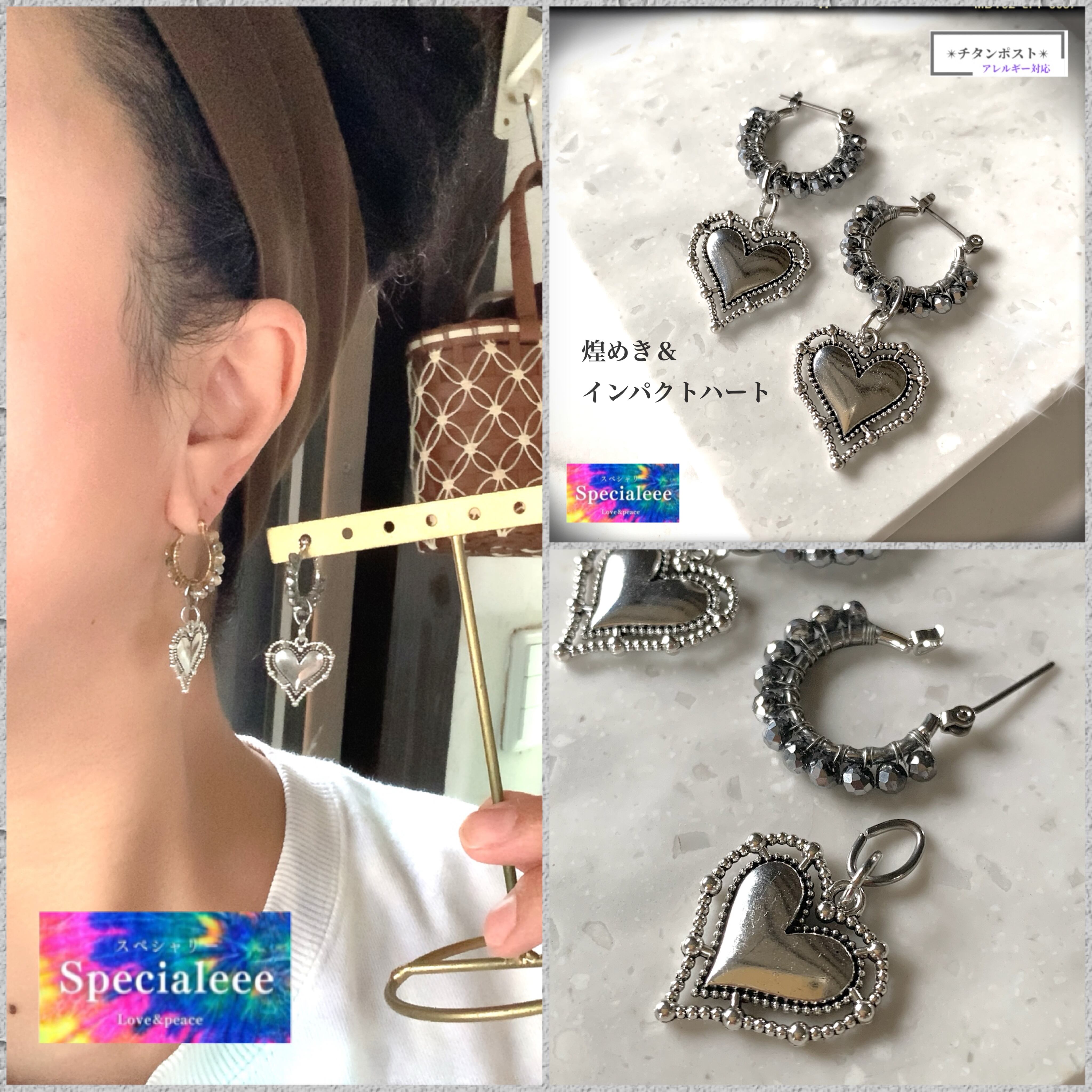 ギラめくメタリックシルバーフープ&インパクトハートチタンピアス★存在感と個性★揺れる★金属アレルギー対応★オリジナルハンドメイドアクセサリー