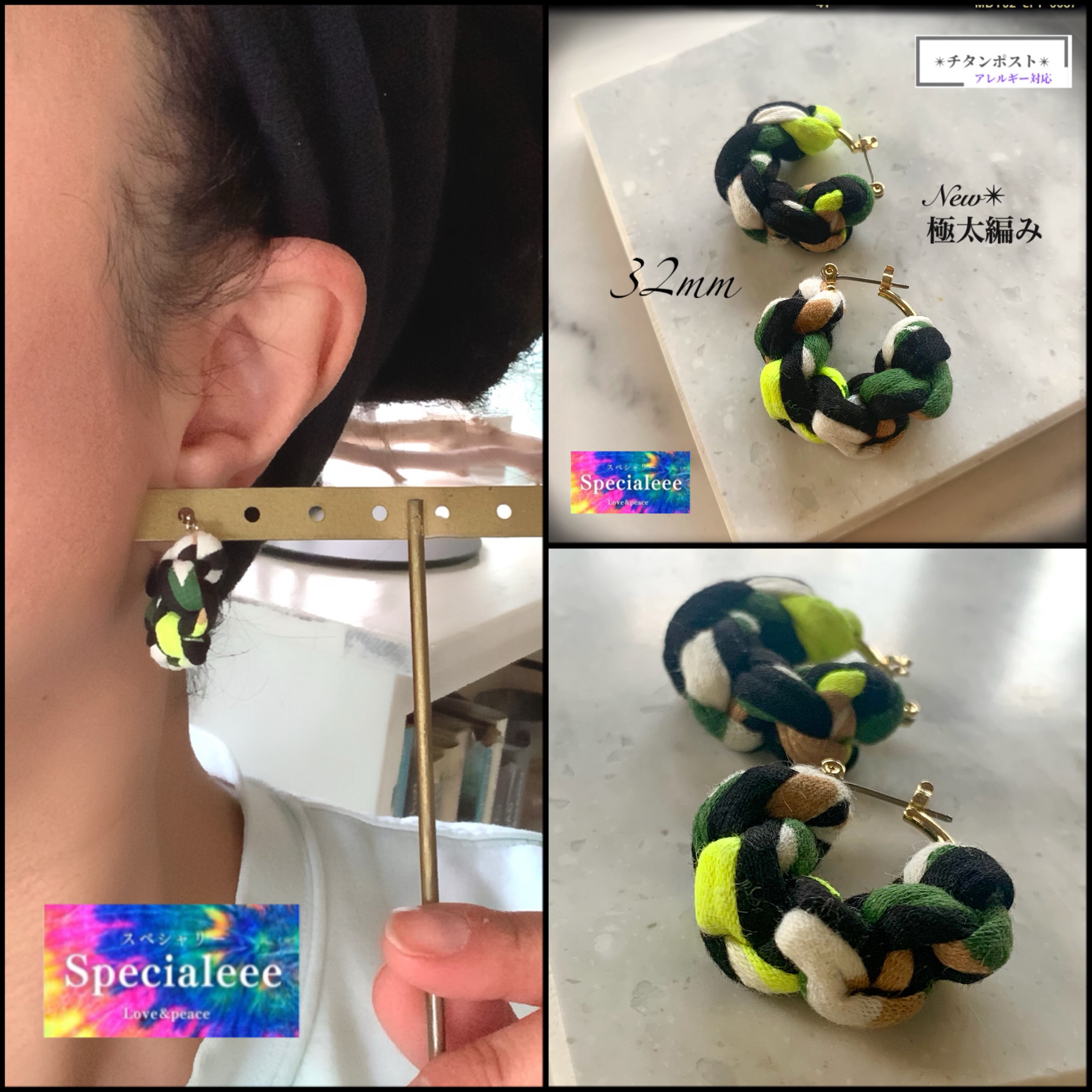 限定カラー★極太編み新作シリーズ★32mmネオンイエロー入り迷彩フープピアス★カモフラ★お洒落★個性的★ハンドメイドアクセサリーspecialeee