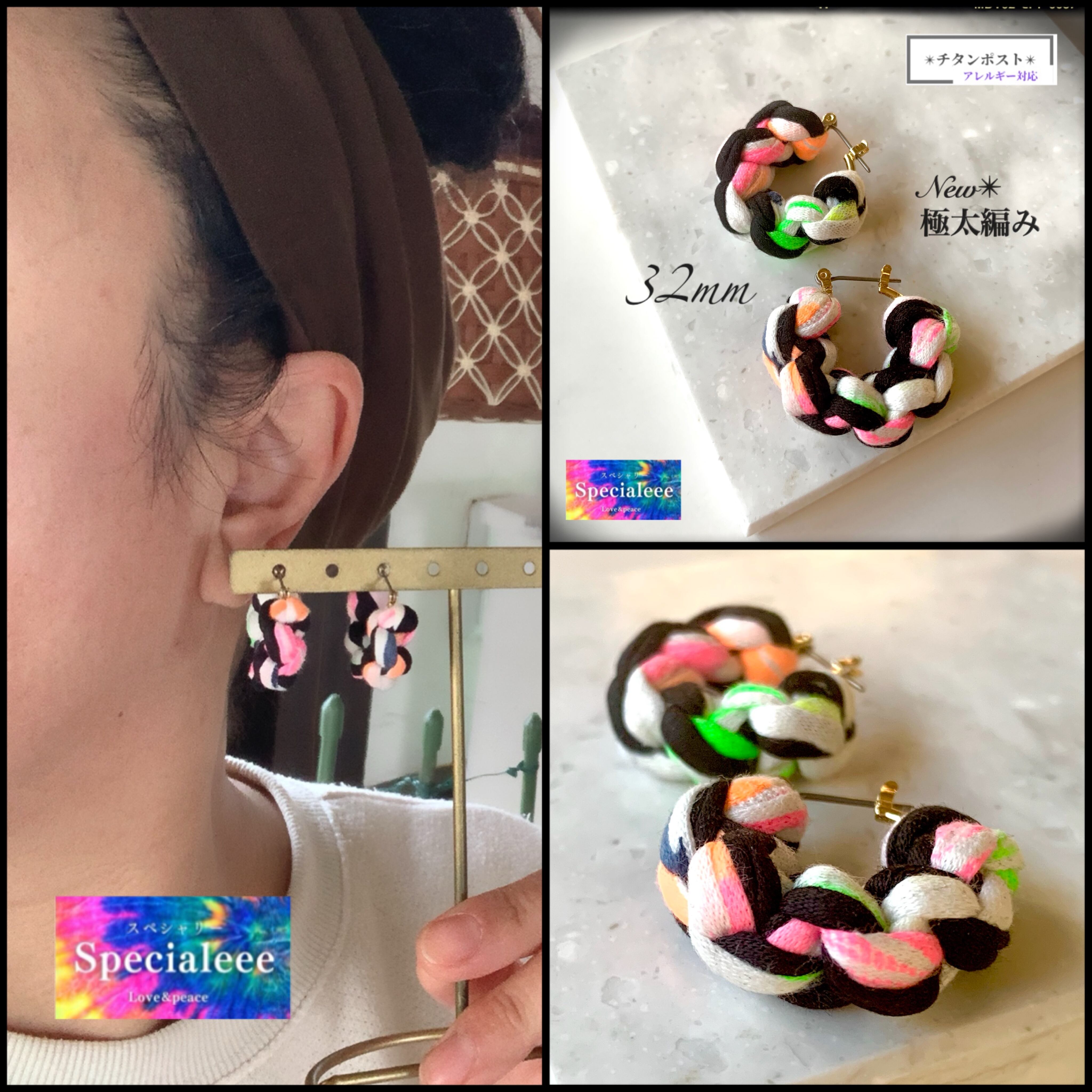極太編み新作シリーズ★32mm黒&白ネオンカラフルチタンフープピアス★派手可愛い★チタンポスト★個性的★