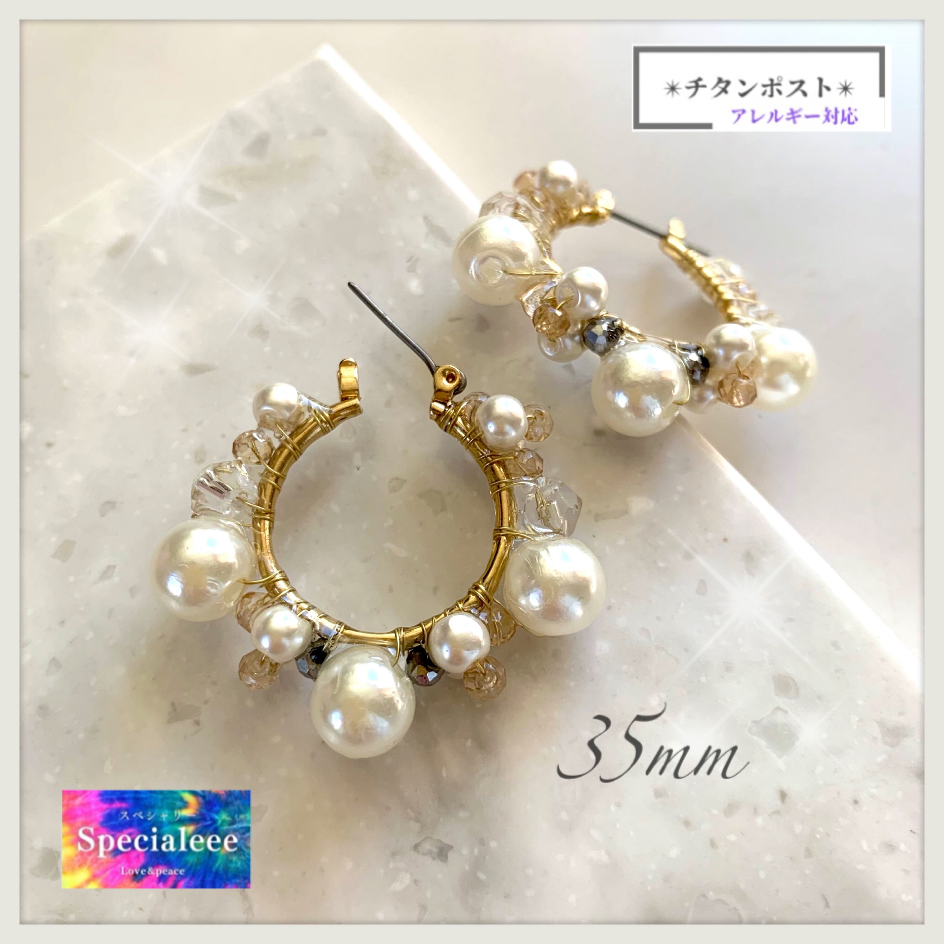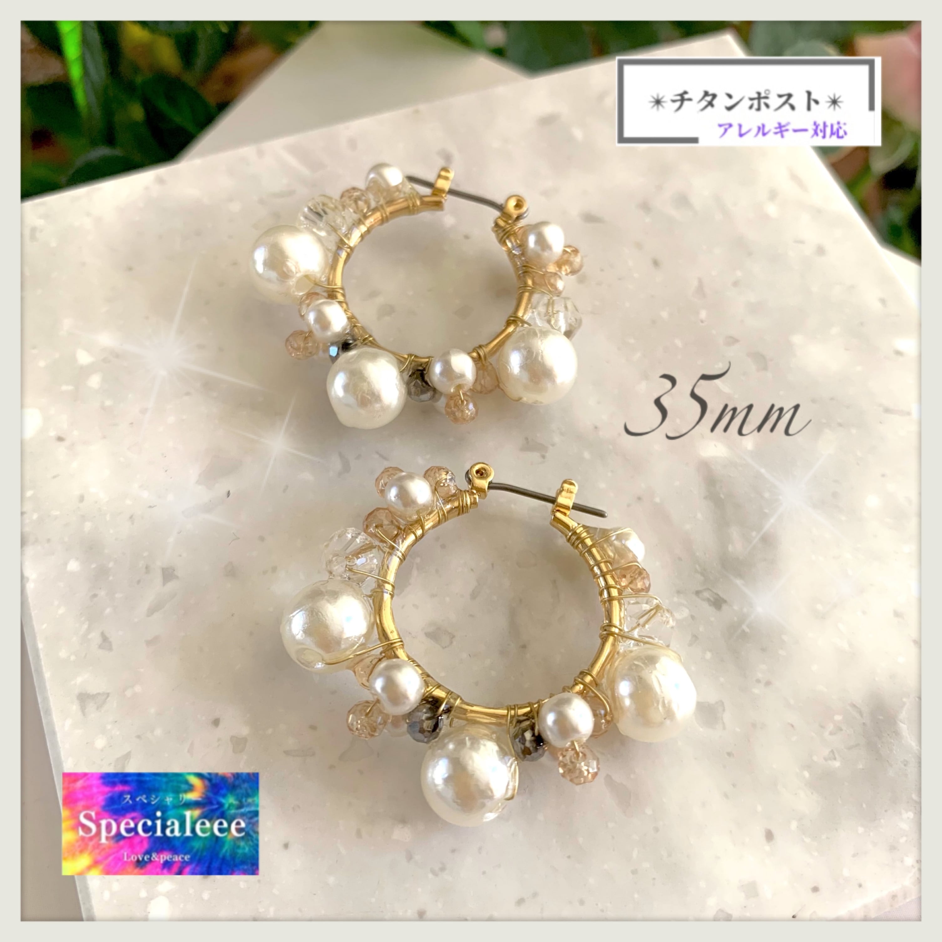 大粒パール&煌めきビーズのチタンフープピアス☆フォーマルにも☆キラキラ個性☆フォーマル★入学式★卒業式★オリジナルハンドメイドアクセサリー★