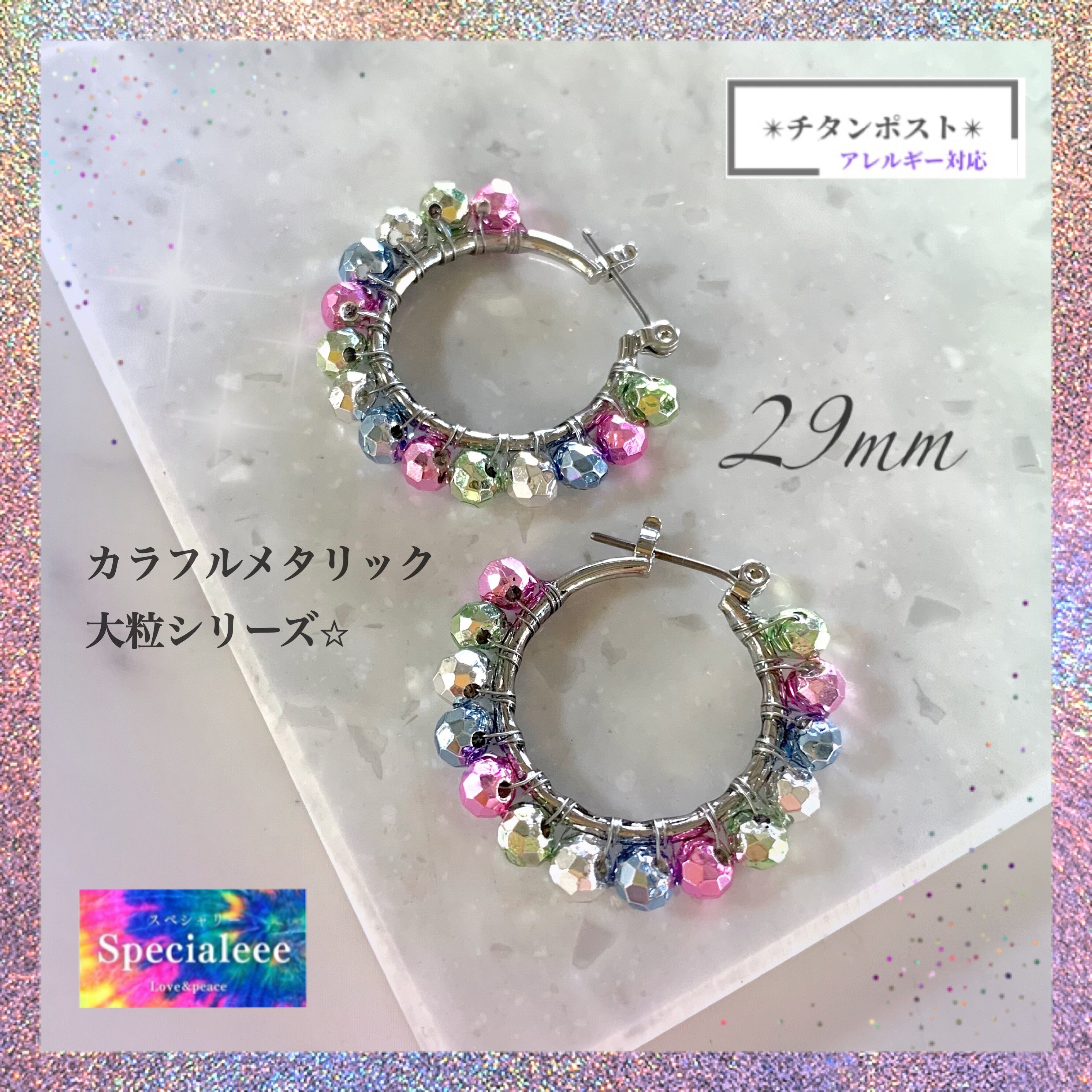 NEW★カラフルメタリック大粒フープピアス★シルバー★派手個性★金属アレルギー対応チタン★キラキラ☆ギラギラ★ハンドメイドアクセサリーspecialeee